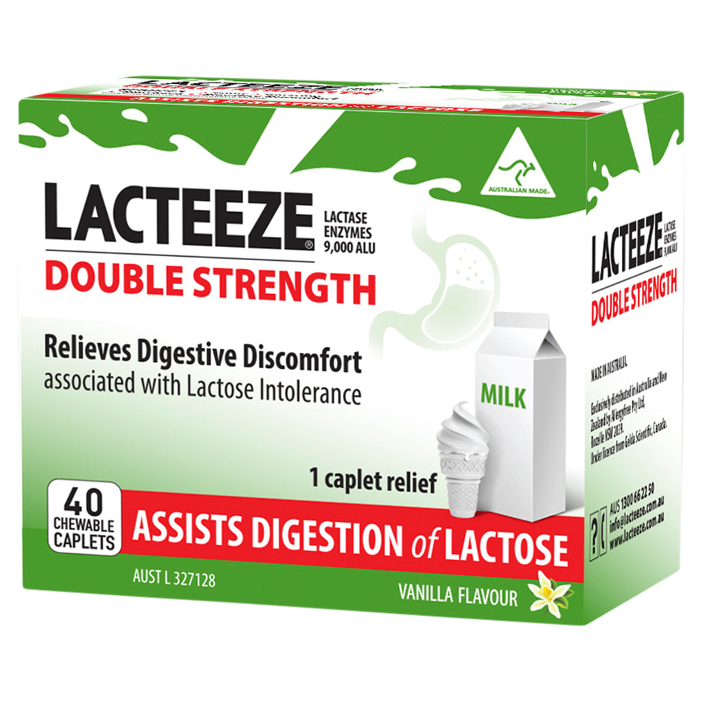 LACTEEZE DOUBLE STRENGTH contains over double the level of lactase enzymes of any other product in Australia. Lacteeze Double Strength assists the digestion of lactose in dairy products, providing effective relief of wind, bloating and digestive discomfort associated with lactose intolerance. Lacteeze tablets are specifically formulated for moderate to severe lactose intolerance. Simply take 1 caplet just before consuming food containing lactose. Lacteeze contains no preservatives, artificial colours or flavours. It is yeast, dairy, gluten, egg and nut free. Certified Kosher. Monash University Low FODMAP Certified.Strength: 9,000 ALU.