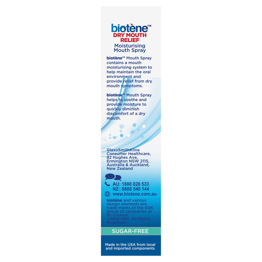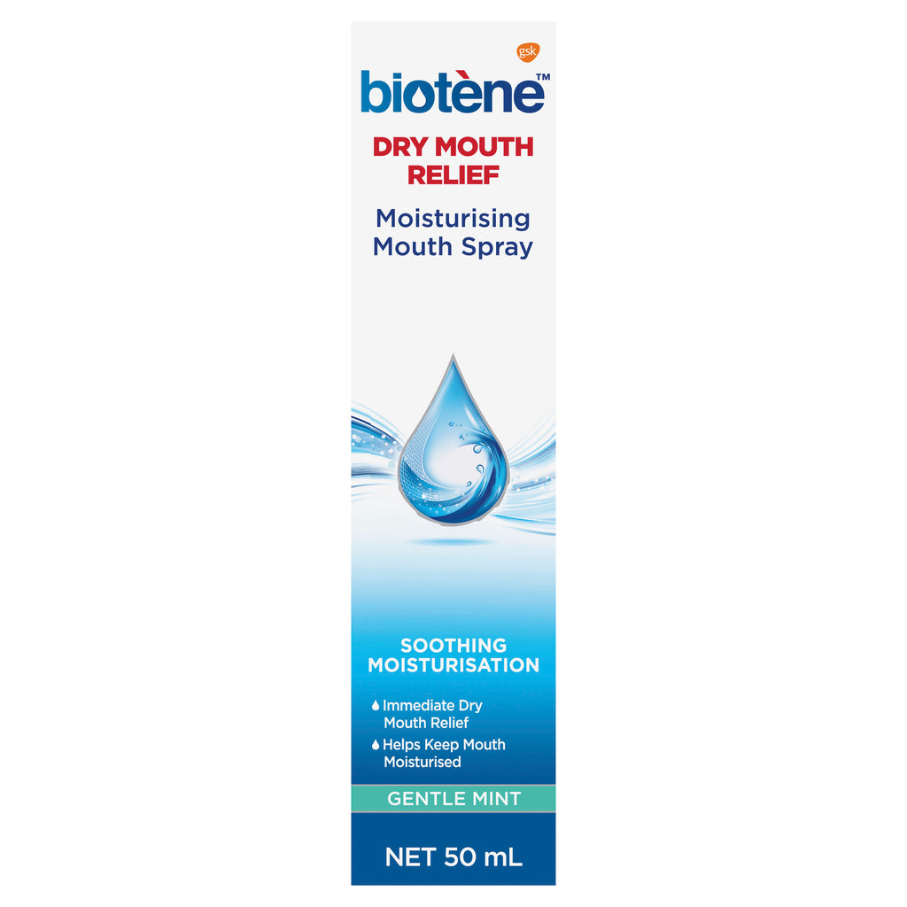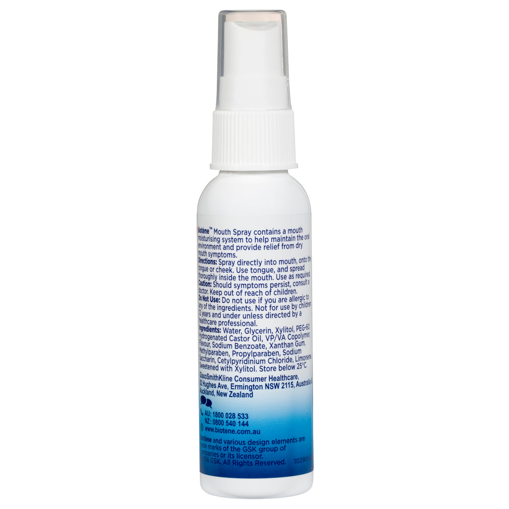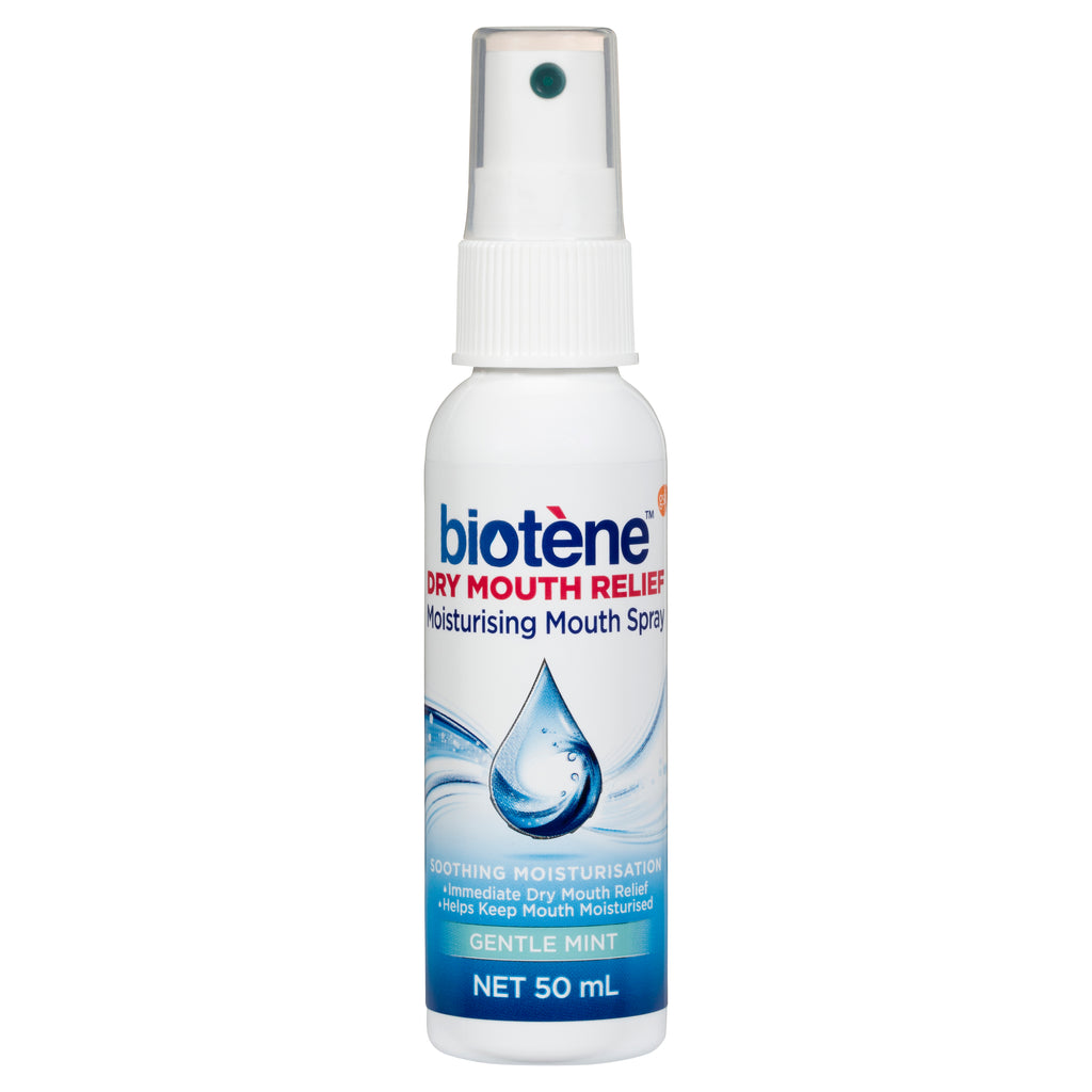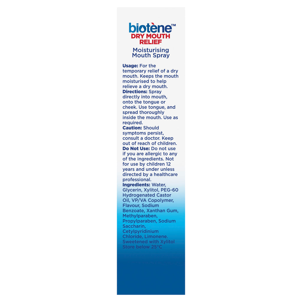 Biotene Mouth Spray contains a mouth moisturising system to help maintain the oral environment and provide relief from dry mouth symptoms.