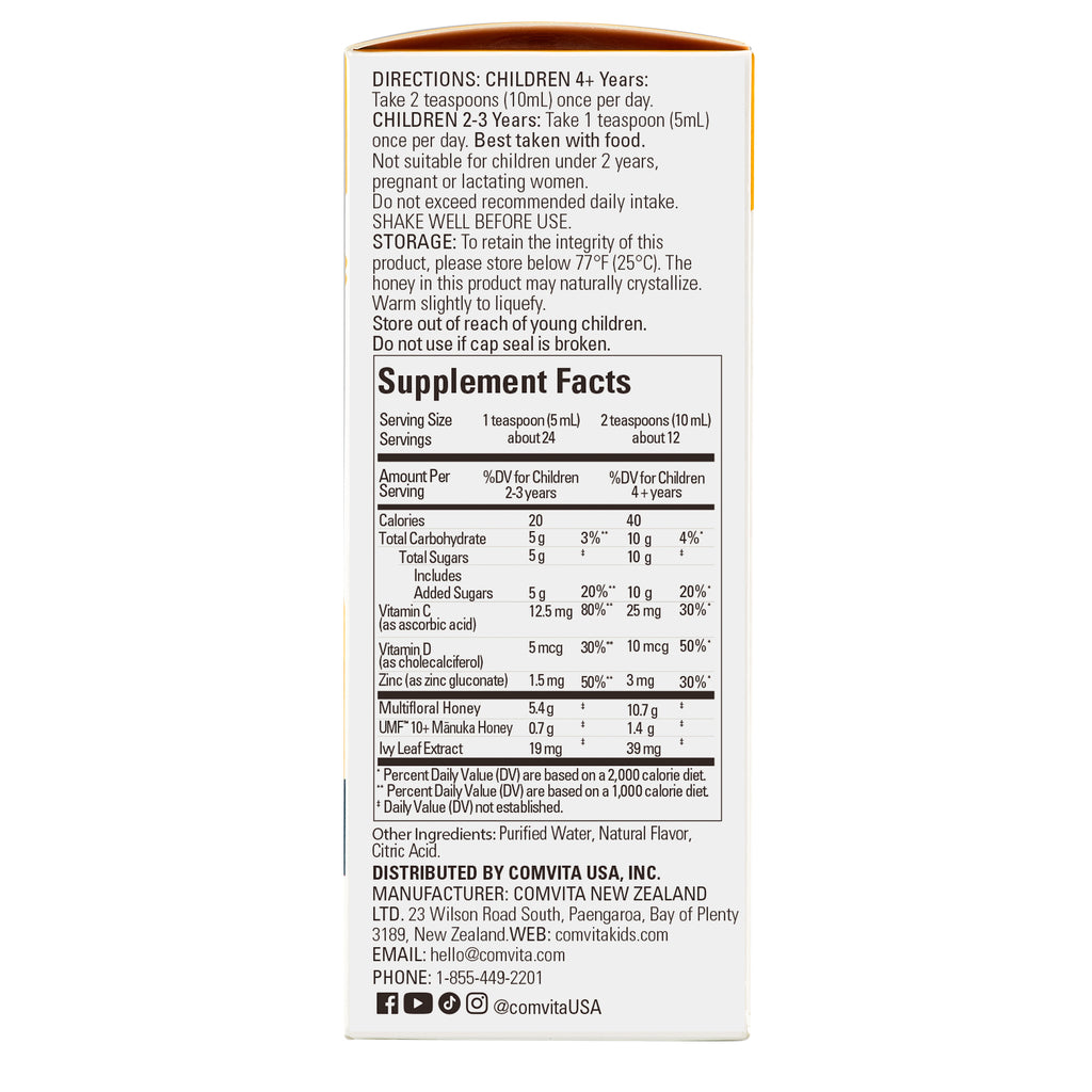 Like minded mums and dads around the world use honey to soothe kids throats. Comvita Kids Honey Day-Time Syrup with Multifloral, UMF 10+ Manuka Honey, Ivy Leaf Extract, Vitamins C, D and Zinc all work together to care for your little ones.Try our Comvita Kids Honey Night-Time Soothing Syrup with Chamomile which supports restful sleep. Used together, Comvita Kids Soothing Syrups are a delicious way to natural soothe, settle and support.