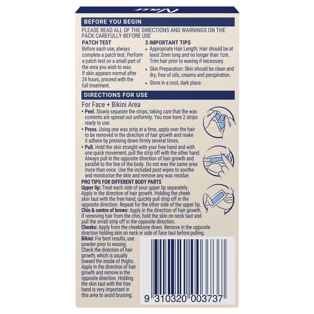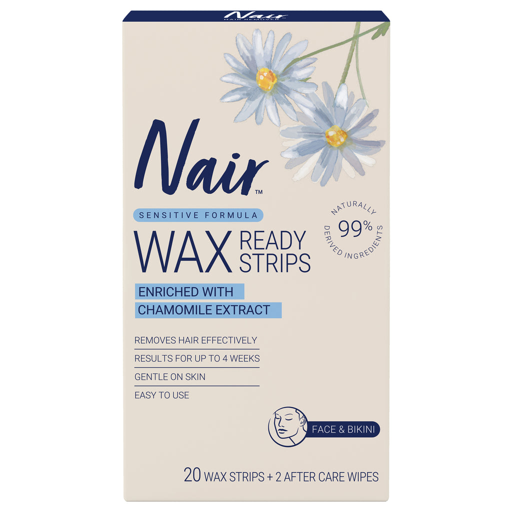 Achieve quick and precise hair removal with Nair Natural Mini Wax Strips for Face & Bikini – 20 Pack. Formulated with 99% naturally derived ingredients, these ready-to-use wax strips provide a simple and effective way to remove unwanted hair from the face, underarms, and bikini area. Infused with soothing chamomile extract and nourishing oils, they help to care for your skin while delivering smooth, long-lasting results.