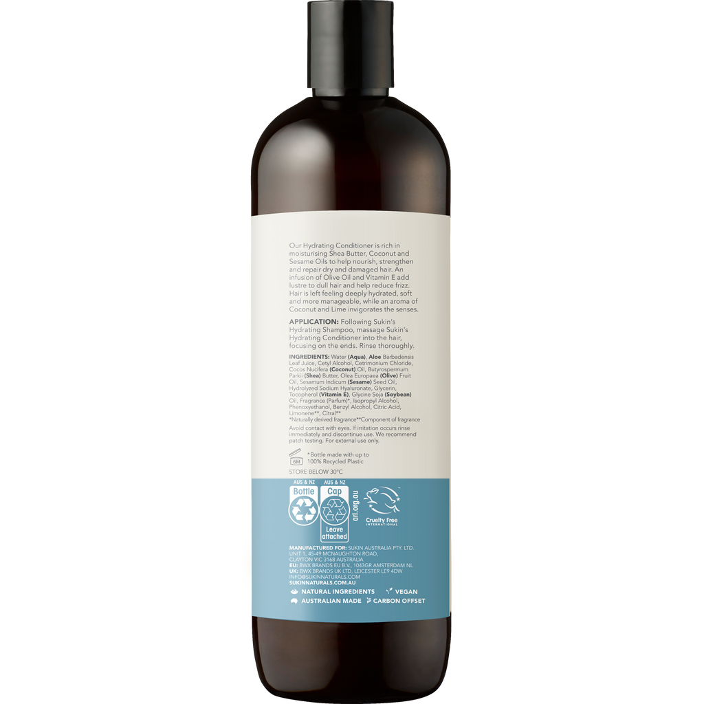 Transform dry and damaged hair with Sukin Hydrating Conditioner, perfect for nourishing and revitalizing your locks. This conditioner is enriched with natural ingredients designed to enhance hair health and provide a luxurious experience. - **Moisturizing Formula**: Infused with Shea Butter, Coconut, and Sesame Oils to deliver intense hydration. - **Frizz Control**: Olive Oil and Vitamin E work together to tame frizz and restore shine. - **Enhanced Manageability**: Leaves your hair soft, smooth, and easy to style. - **Invigorating Aroma**: Enjoy a refreshing Coconut and Lime scent with every wash. Ideal for daily use after your shampoo routine! Add to cart for delivery NZ-wide.