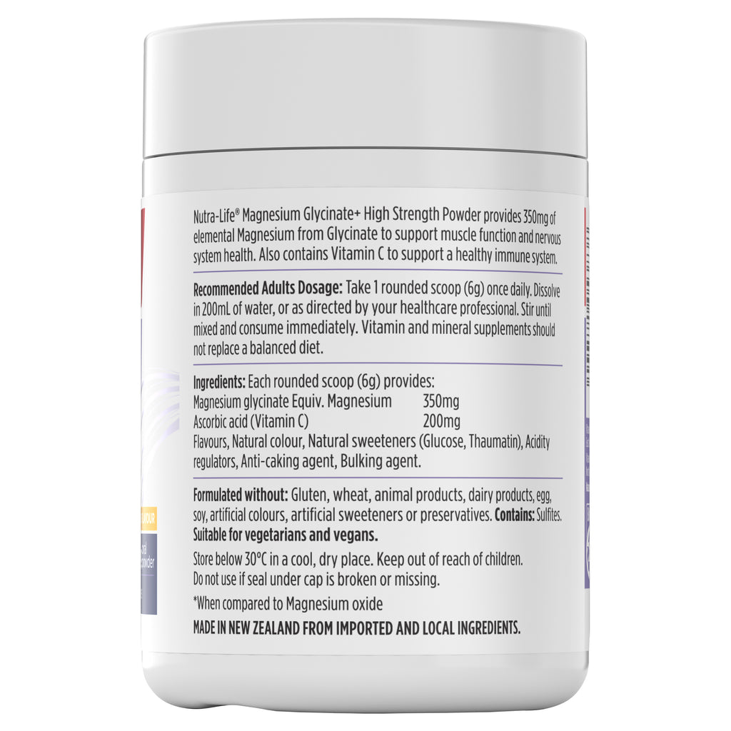 Nutra-Life® Magnesium Glycinate+ High Strength Powder provides 350mg of elemental Magnesium from Glycinate to support muscle function & nervous system health. Also contains Vitamin C to support immune system health.