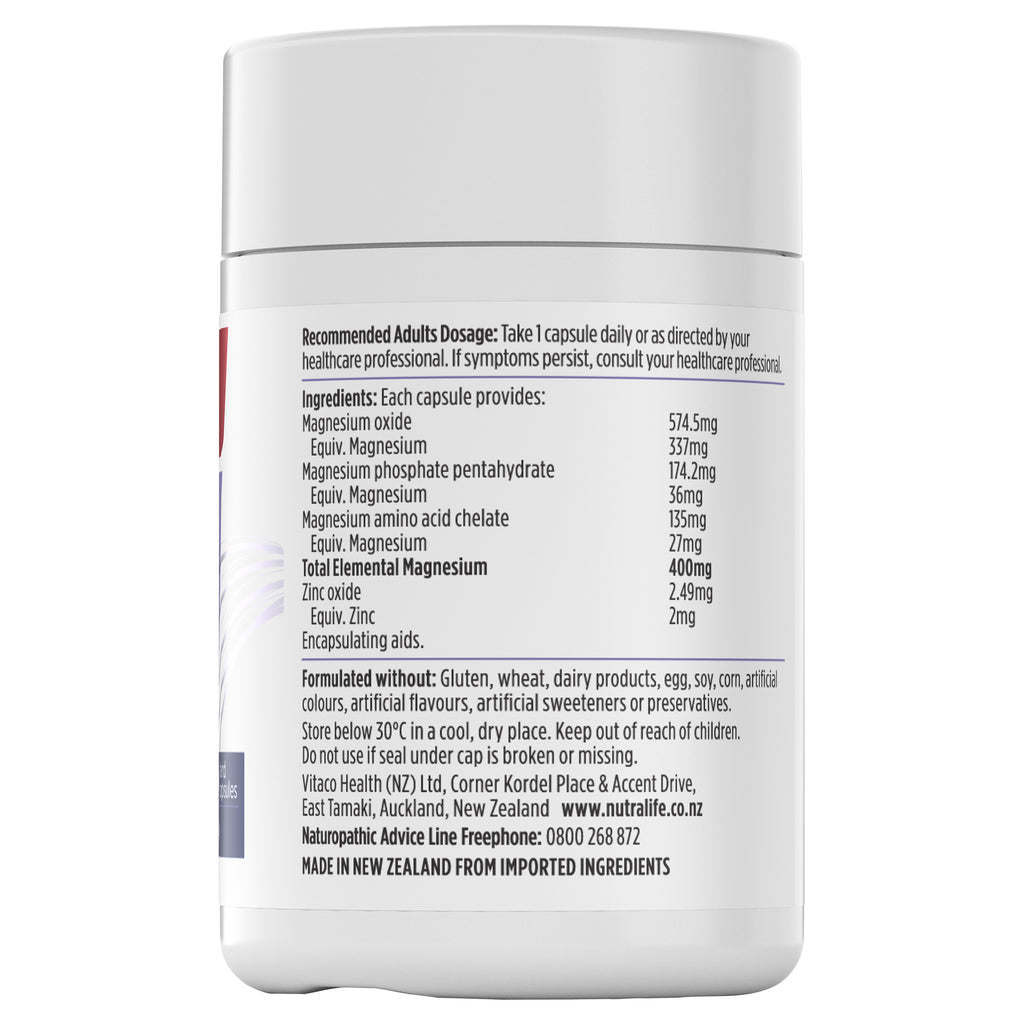 Nutra-Life® Magnesium Complete 400 combines the power of 3 different forms of Magnesium – Amino Acid Chelate, Phosphate & Oxide – for optimised absorption, with the added support of Zinc. This complete formula delivers a high dose of 400mg of elemental Magnesium. It helps to soothe muscle tension, support nervous system health & bone & heart health.