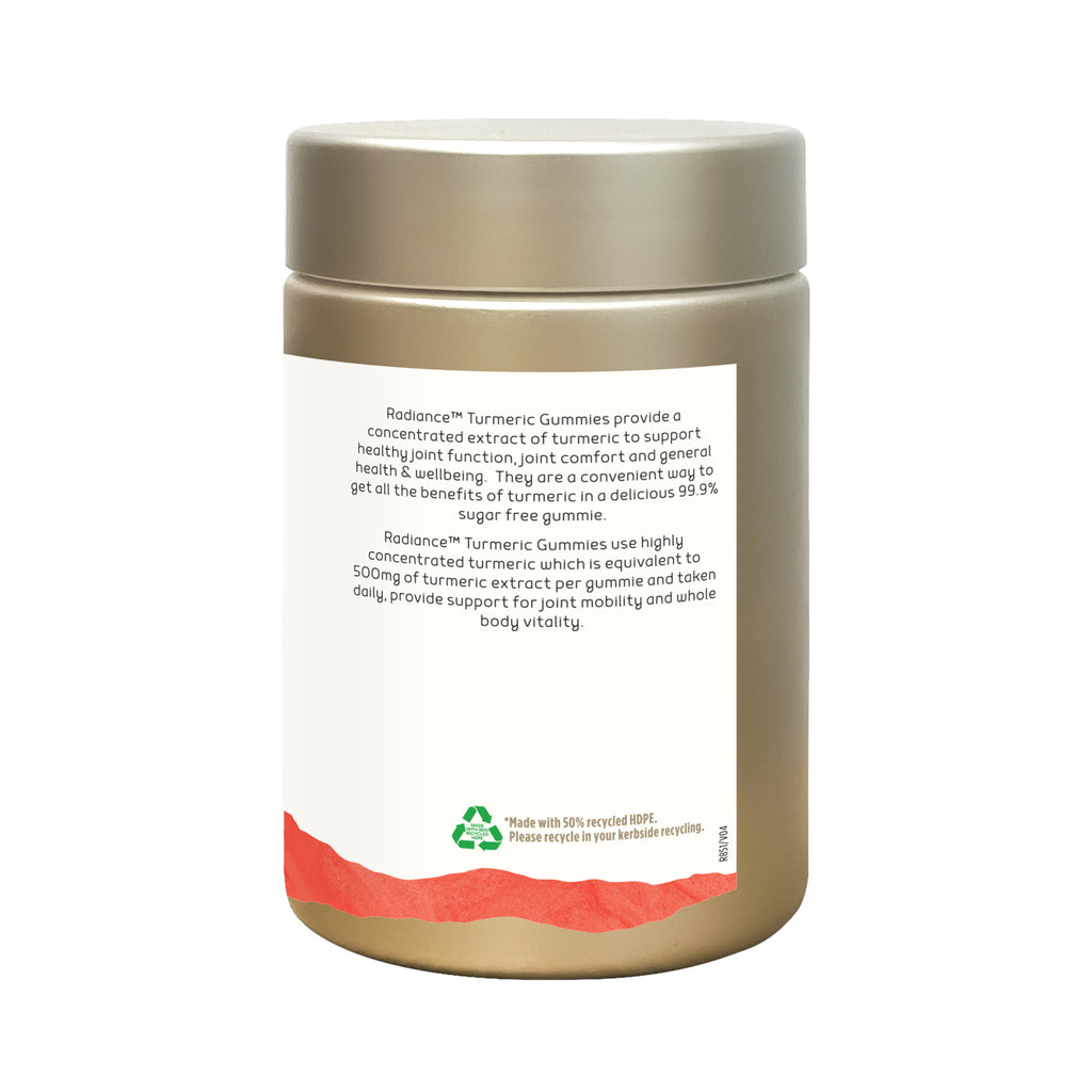 Radiance Turmeric Gummies use highly concentrated turmeric which is equivalent to 500mg of turmeric extract per gummie and taken daily, provide support for joint mobility and whole body vitality.