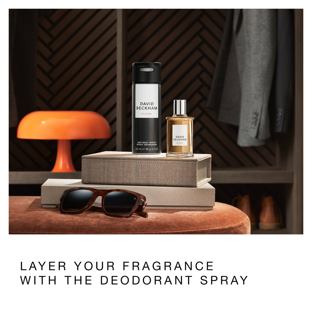 The effervescent freshness of gin tonic and lime combine with spices and warm woody notes in David Beckham Classic Deodorant Body Spray, a subtly scented grooming essential for a man of enduring style. David Beckham Classic Deodorant Body Spray adds a light layer of scent while keeping odor at bay. The importance David Beckham places on looking after yourself is intertwined in his fragrances, and together you can share in that instinctive style and complement your distinctive look.