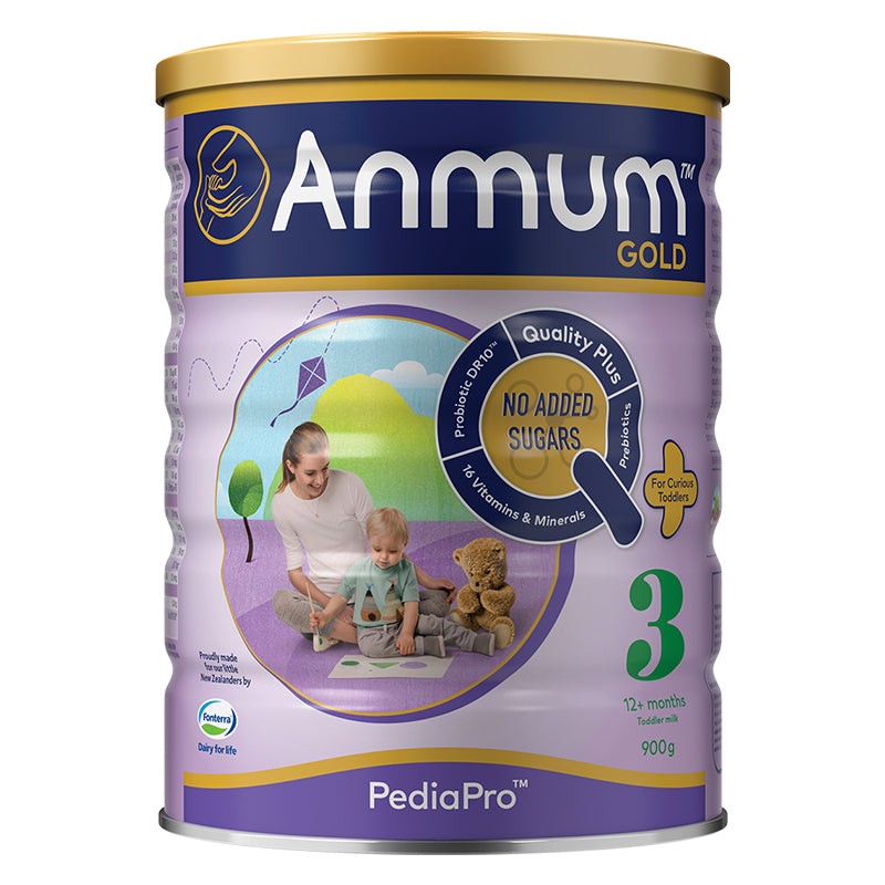 From 12 months, your toddler’s an active little person – playing, exploring and getting up to mischief. So we’ve developed Anmum PediaPro3 Toddler Milk, with no added sugars, only lactose, the sugar found naturally in milk. Made right here in New Zealand, it's designed to complement what toddlers eat during the day. With Probiotic DR10™, and prebiotics, as well as essential vitamins and minerals to provide nutrition support for their active bodies and minds.