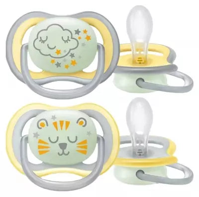 Avent Ultra Air Nighttime 2 Soothers Orthodontic 18+ Months is a set of two orthodontic soothers with long-lasting glow-in-the-dark noses, making them easy to find.These 2 soothers come in a practical case for transport and sterilization.