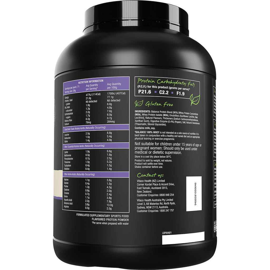 IngredientsBalance Protein Blend (96%) [Whey Protein Concentrate (Milk), Whey Protein Isolate (Milk), Emulsifiers (Sunflower Lecithin, Soy Lecithin)], Natural Flavours, Thickeners (Sodium Carboxymethylcellulose, Xanthan Gum), Digestive Enzyme (0.4%) (Papain), Salt, Natural Sweeteners (Thaumatin, Steviol Glycosides).Contains milk, soy.This Balance Proprietary Protein Blend provides:A full complement of amino acids. High levels of essential whey protein fractions including Glycomacropeptides, Lactalbumen and Lactoglobulin plus 22g of Branched Chain Amino Acids per 100g of protein.L-Arginine and L-Glutamine to support muscle growth.BENEFITS