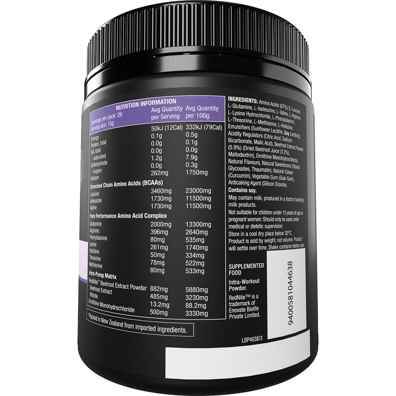 Amino Acids (67%) [L-Leucine, L-Glutamine, L-Isoleucine, L-Valine, L-Arginine, L-Lysine Hydrochloride, L-Phenylalanine, L-Threonine, L-Methionine, L-Histidine, Emulsifiers (Sunflower Lecithin, Soy Lecithin)], Acidity Regulators (Citric Acid, Sodium Bicarbonate, Malic Acid), Beetroot Extract Powder (5.9%) [Dried Beetroot Juice (3.2%), Maltodextrin], Ornithine Monohydrochloride, Natural Flavours, Natural Sweeteners (Steviol Glycosides, Thaumatin), Natural Colour (Curcumin), Vegetable Gum (Guar Gum), Anticaking Agent (Silicon Dioxide). Contains soy.
