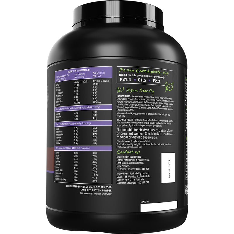 IngredientsBalance Plant Protein Blend (89%) (Pea Protein Isolate, Brown Rice Protein Concentrate, Chia Protein Powder, Sacha Inchi Powder), Natural Flavours, Amino Acids [L-Glutamine (2%), BCAAs (1%) (L-Leucine, L-Isoleucine, L-Valine)], Cocoa Powder, Salt, Digestive Enzyme (0.4%) (Papain), Vegetable Gum (Xanthan Gum), Natural Sweeteners (Thaumatin, Steviol Glycosides).May contain milk, soy; produced in a factory handling milk and soy products.