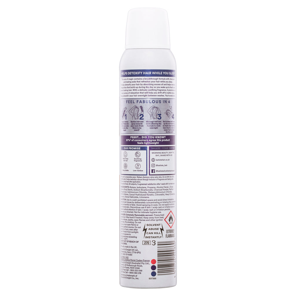 Batiste Overnight Deep Cleanse Dry Shampoo 200mL works while you sleep, so you wake up to fresher, cleaner hair no effort required! Enriched with charcoal and baking soda, this detoxifying dry shampoo absorbs excess oil and impurities that build up throughout the day, leaving your hair feeling purified and refreshed by morning. Simply spray before bed, let the formula work its magic overnight, and wake up to revitalised locks with no white residue. The soothing blend of jasmine, patchouli, and orange blossom adds a touch of relaxation to your nighttime routine, making it the perfect pre-sleep hair refresh.Designed for all hair types, Batiste Overnight Deep Cleanse gives your scalp the reset it needs without drying out your strands. Whether you’re skipping a wash, dealing with product buildup, or just want to reclaim more of your morning, this overnight dry shampoo takes care of everything while you catch some ZZZs. Because great hair days should start the moment you wake up!Why choose Batiste Overnight Deep Cleanse Dry Shampoo?Its charcoal-infused formula detoxifies and absorbs oil while you sleep, leaving your hair fresh, purified, and effortlessly clean by morning no white residue, no hassle!