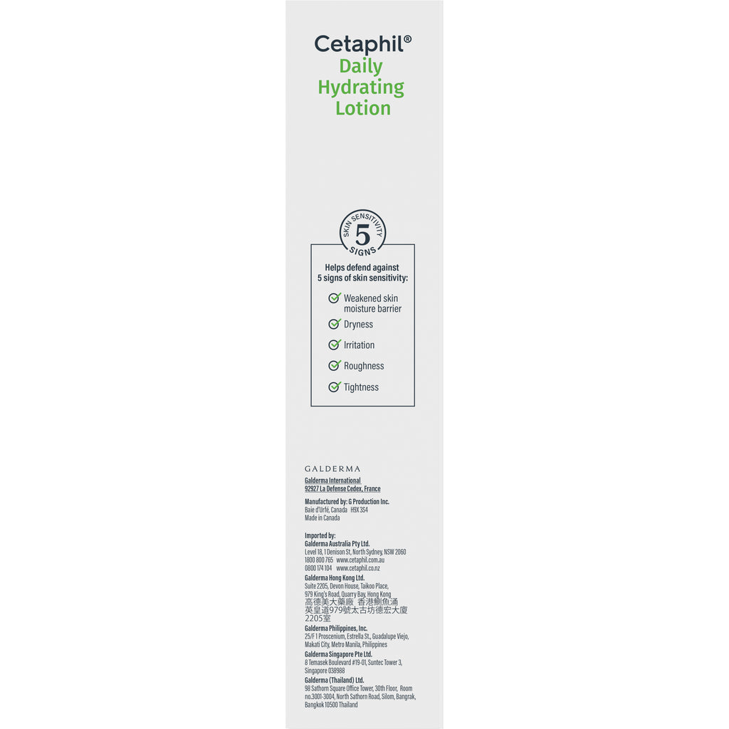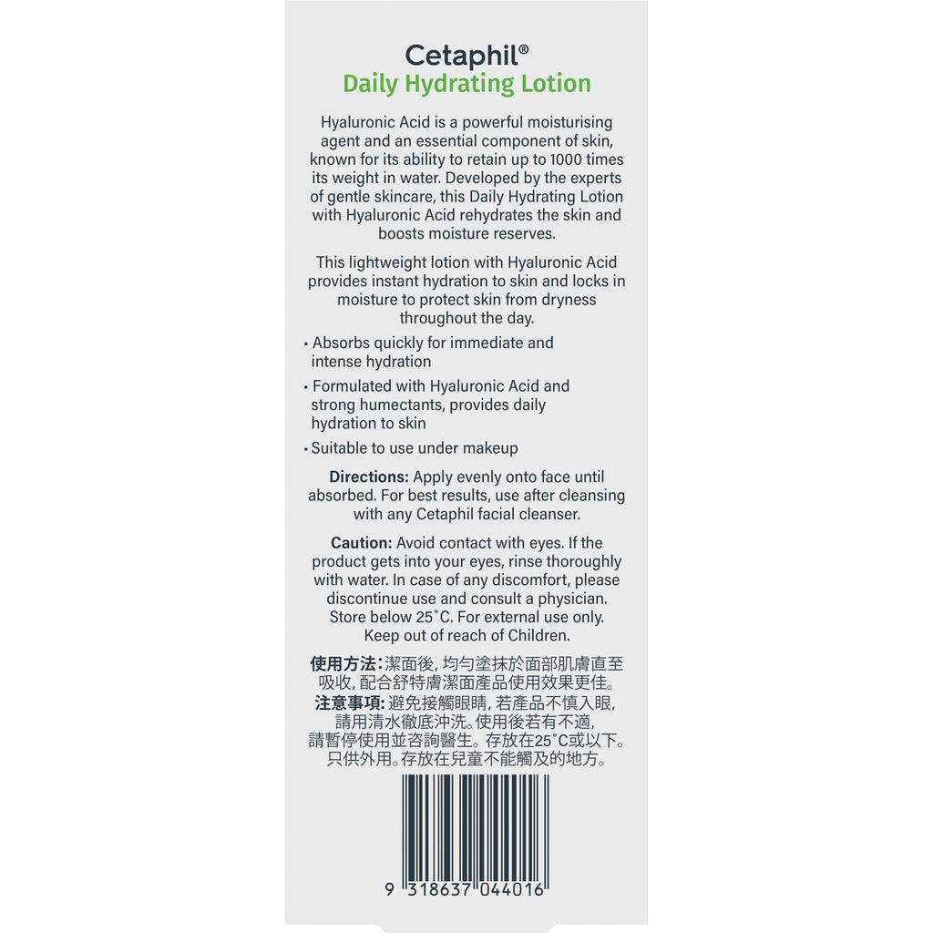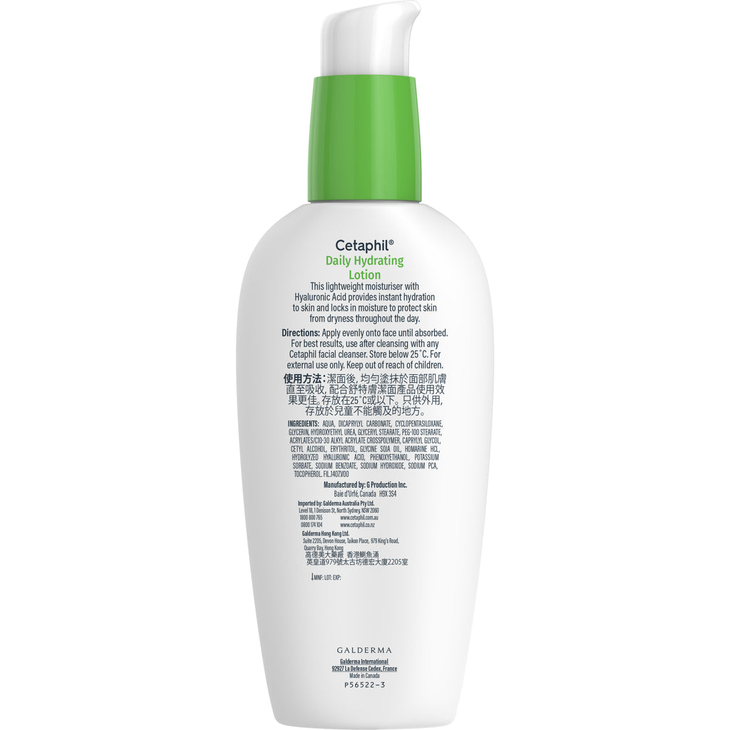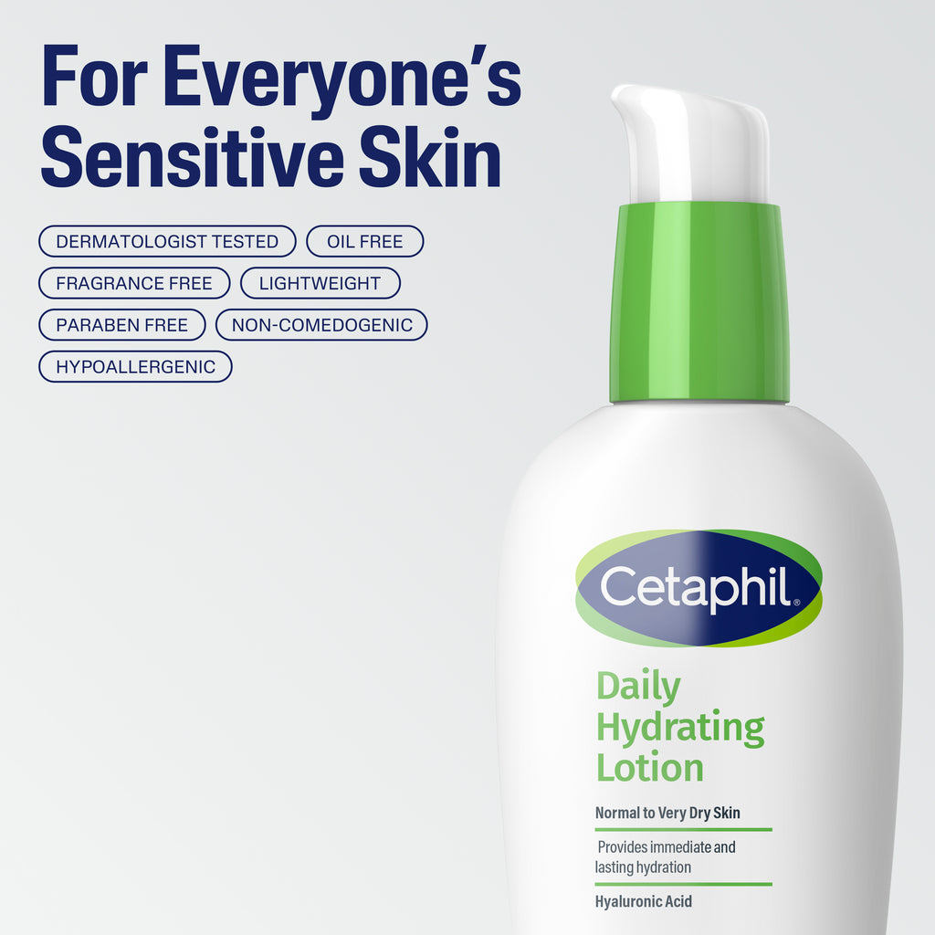 Cetaphil Daily Hydrating Lotion with Hyaluronic Acid and strong humectants absorbs fast to intensely hydrate your skin and boost moisture reserves. Gentle enough for daily use on sensitive skin, this lightweight moisturiser is hypoallergenic, won't clog pores, and contains no parabens or fragrance. Suitable for normal to very dry skin.