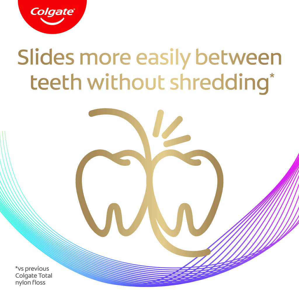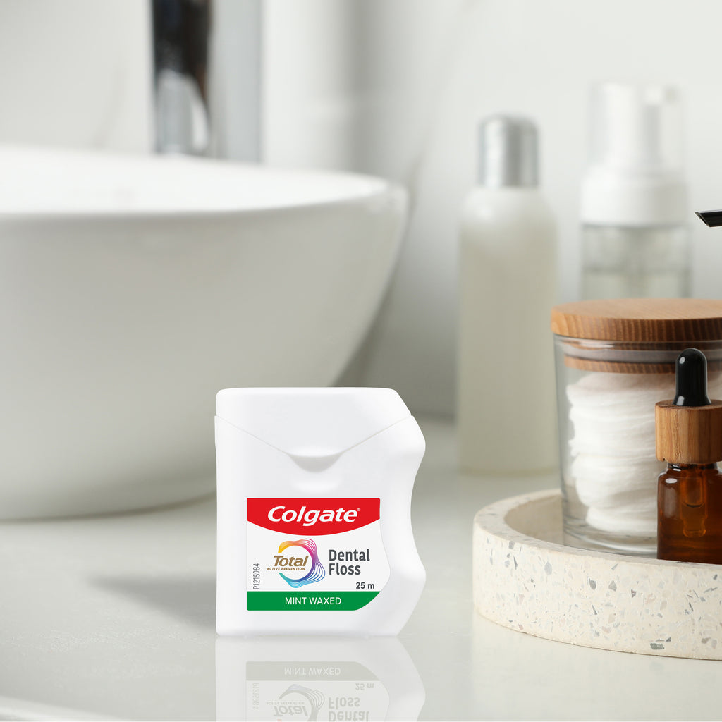 Colgate Total Mint Waxed Dental Floss slides more easily between the teeth*, less shredding* and reaches areas that brushing can't - for improved mouth health.Flossing is an important part of your daily oral hygiene routine. Flossing helps to protect gums and reduce tooth decay by removing plaque between teeth and along the gum line.Freshen your mouth with the Colgate Total Mint Waxed Dental Floss in a Mint Flavour for improved mouth health.- Helps to protect gums and prevent tooth decay by removing plaque between teeth and along the gumline.- Slides more easily between teeth*- Less shredding*- PTFE/PFAS Free- Great mint flavourProper flossing removes plaque and food particles in places where a toothbrush cannot easily reach — under the gumline and between your teeth.Daily flossing is highly recommended in your oral care routine.Pack Size: 25mHow to use:1. Wrap about 50cm around your middle fingers2. Insert floss at the top of the tooth and work gently downwards3. Clean both sides of the tooth and along the gumline, using a clean section of floss every few teethMade with recyclable cardboard packaging.*vs previous Colgate Total nylon floss.