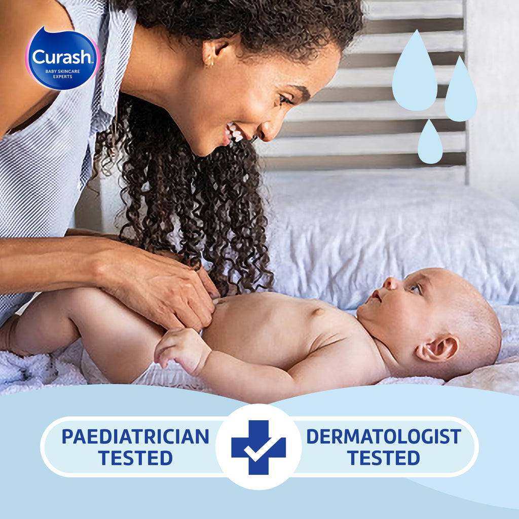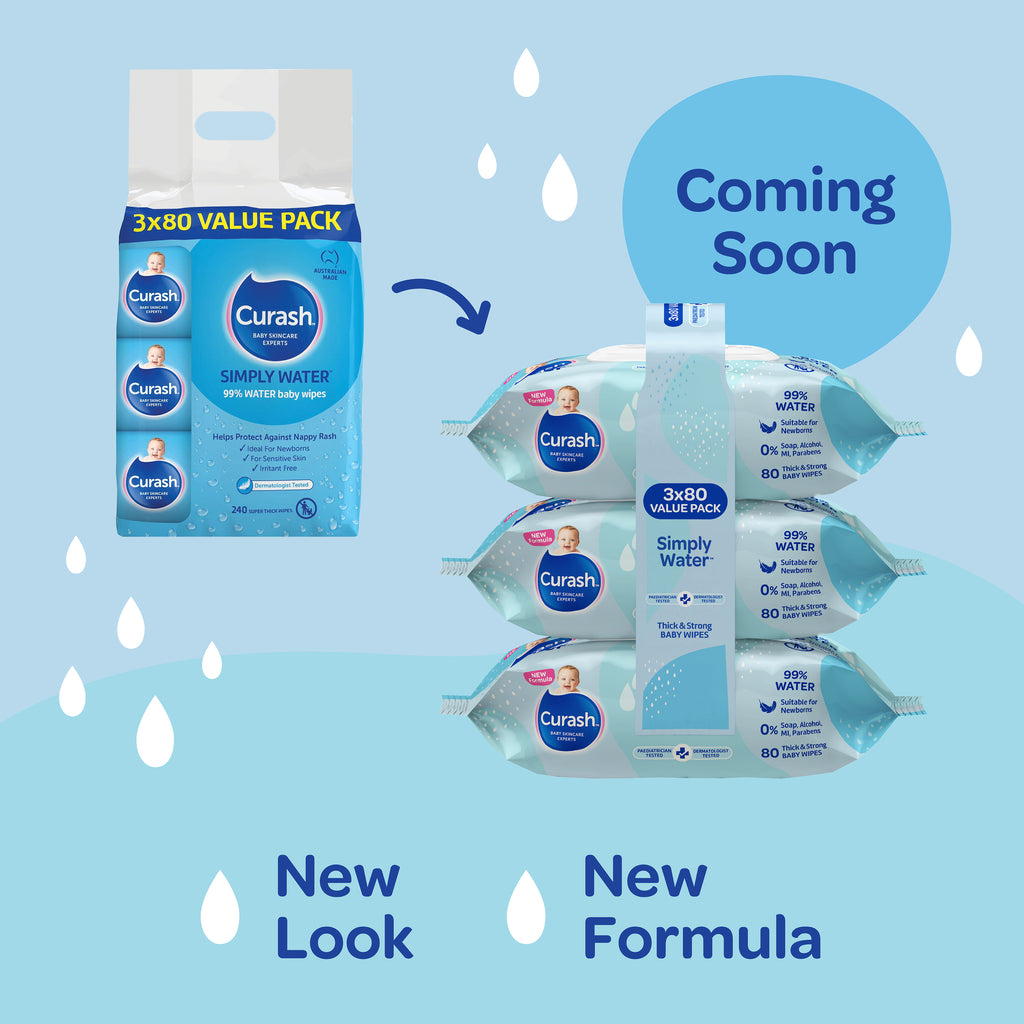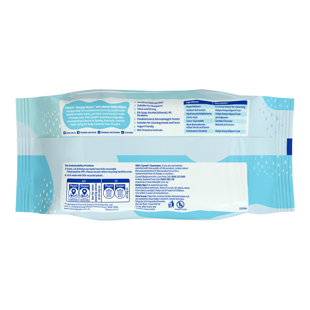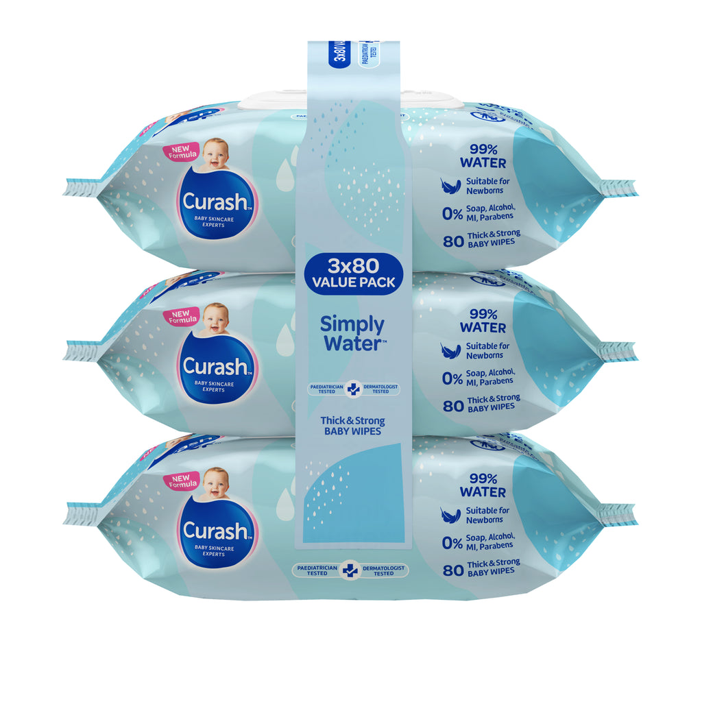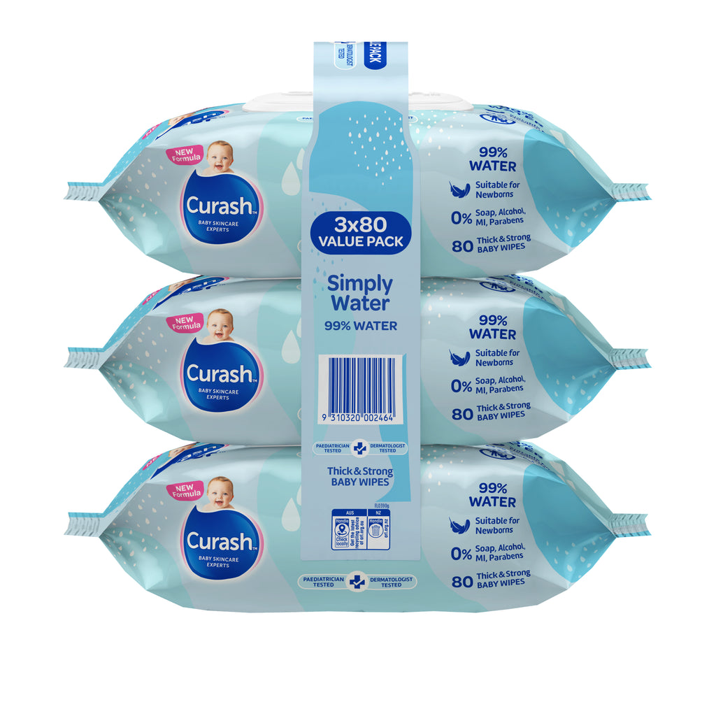 NEW Formula Curash Simply Water Baby Wipes contain 99% purified water and are specially formulated with 0% soap, alcohol, MI or parabens. They are Dermatologist and Paediatrician tested to be suitable for even newborns' delicate skin. Curash Simply Water Baby Wipes are thick, soft and strong to make cleanups easy at nappy change time. They are vegan friendly, not tested on animals and also suitable to clean little hands and faces. Our new packaging is fully recyclable and the Easy Seal lid contains 30% recycled plastic.The Curash brand was originally developed by a doctor in Sydney, Australia, and has been caring for baby's skin for over 35 years.