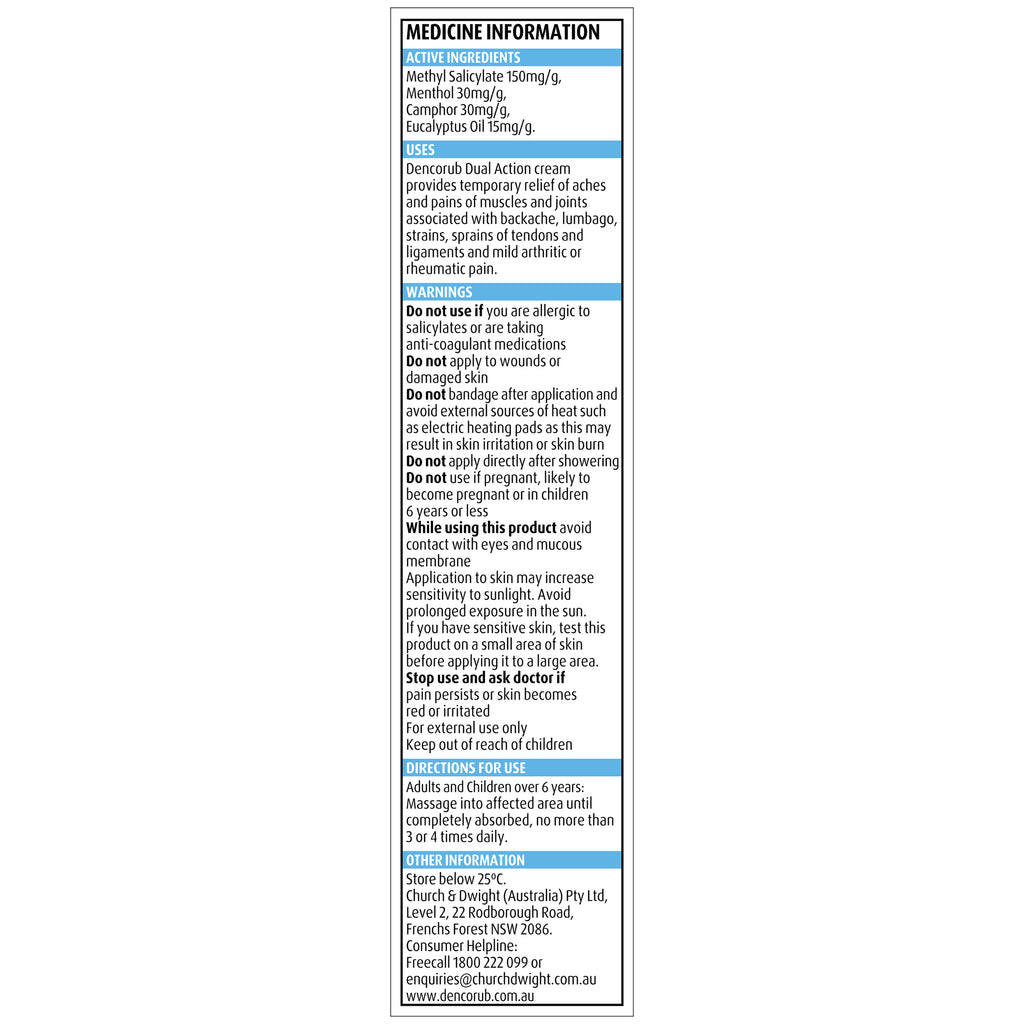 Formulated to assist with temporary relief of aches and pains associated with backaches, sprains, strains and joint issues, Dencorub Dual Action Cream is a handy addition to any medicine cabinet in the home, as well as being an essential for your gym or sports bag.