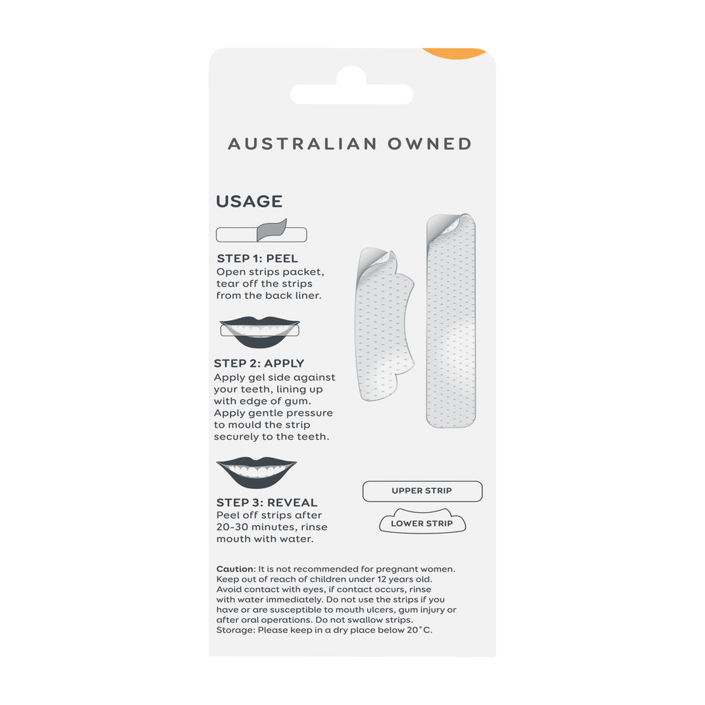 Dentagenie Whitening Strips with 6% hydrogen peroxide are premium teeth whitening strips for fast and effective whitening in the home. 6% hydrogen peroxide for quick, visible results.Non-slip strips make for comfortable wear for up to 30 mins at a time.Enamel safe technology.Fresh Minty FlavourIdeal top-up to your whitening regimen in between visits to the clinic, and if you are new to whitening, priced for everyone to have a super white smile.Can be used once a day for 14 days or twice a day for 7 days for quicker results. Recommend using as a top when you feel you need a little brightening. Leave a full week between applying a full 7 or 14 day repeat. CAUTION; It is not recommended for pregnant women. Keep out of reach of children under 12 years old. Avoid contact with eyes. If contact occurs, rinse with water immediately. Do not use the strips if you have or are susceptible to mouth ulcers, gum injury or after oral operations. Do not swallow strips.STORAGE; Keep in a dry place below 20 degrees C.