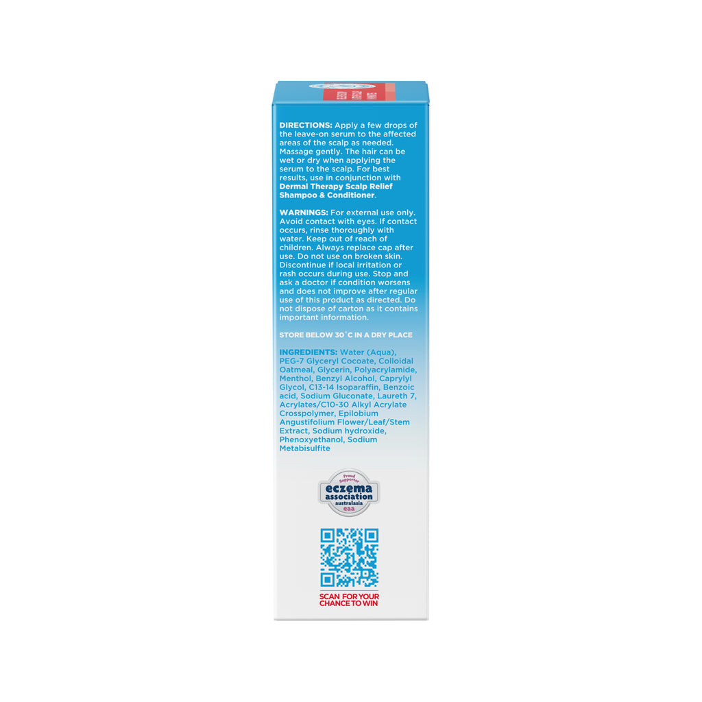 Dermal Therapy Scalp Relief Serum is a leave-on product designed to improve scalp health. It moisturises, soothes and provides relief for scalp itchiness associated with dry, irritated scalps. It is formulated with Colloidal Oatmeal for skin-soothing moisturisation, Canadian Willowherb to calm irritation and Menthol for its cooling effect. It is clinically tested to provide relief in minutes and is suitable for daily and long term use.