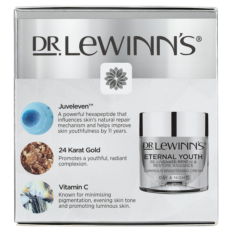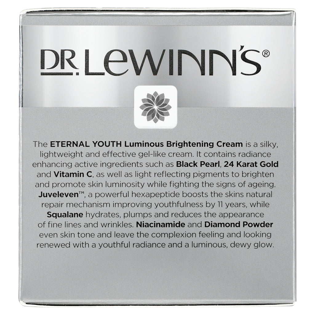 The Eternal Youth Luminous Brightening Cream is a silky, lightweight and effective gel-like cream. It contains radiance enhancing active ingredients such as Black Pearl, 24 Karat Gold and Vitamin C, as well as light reflecting pigments to brighten and promote skin luminosity while fighting the signs of ageing. Juveleven™, a powerful hexapeptide boosts the skins natural repair mechanism improving youthfulness by 11 years, while Squalane hydrates, plumps and reduces the appearance of fine lines and wrinkles. Niacinamide and Diamond Powder even skin tone and leave the complexion feeling and looking renewed with a youthful radiance and a luminous, dewy glow.Juveleven™ - A powerful hexapeptide that influences skin's natural repair mechanism and helps improve skin youthfulness by 11 yearsVitamin C - Known for minimising pigmentation, evening skin tone and promoting luminous skin24K Gold - Promotes a youthful, radiant complexion Suitable for all skin types and Normal to Dull skin types.