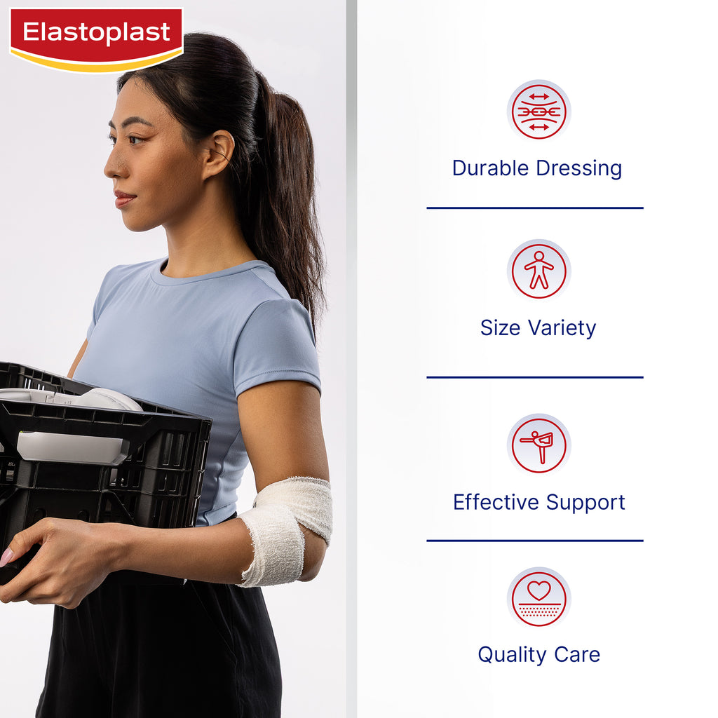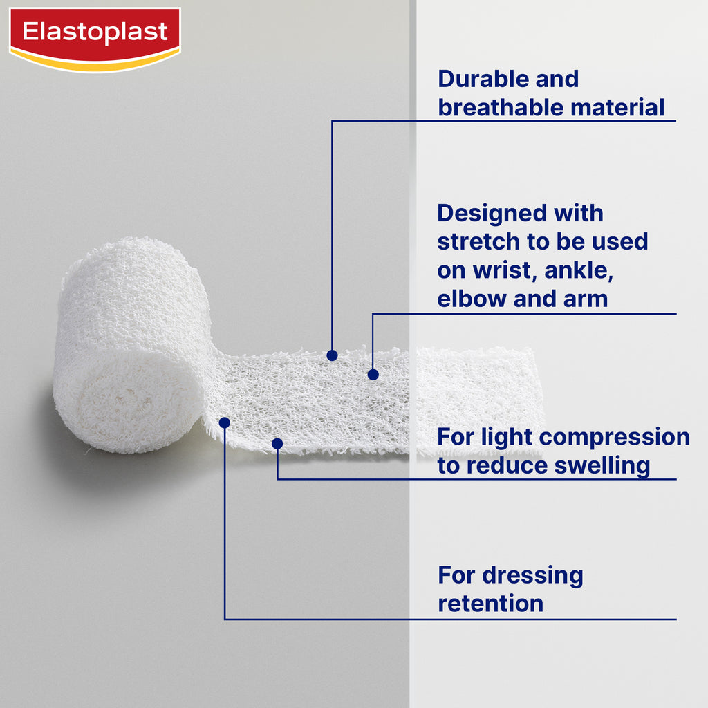 Elastoplast Medium Crepe Bandages are strong support crepes for short to medium-term bandaging requirements. They are ideal for securing wound dressings, supporting strains, and providing compression to alleviate swelling. The medium weight crepe bandage is suitable for use as a dressing retention, for keeping gauze in place and providing light compression. These crepe bandages are suitable for wrist or ankle injuries and around the elbow and arm. Wrapping techniques are simple: For light compression, firmly wrap the injured area using a figure-8 shape or overlap for limb areas such as forearm or calf. Ensure that the areas above and below the injury are covered. Always ensure the binding is comfortable. Should any numbness or tingling sensations arise, unwrap the bandage and rebind less tightly.Always read the label and follow the directions for use.