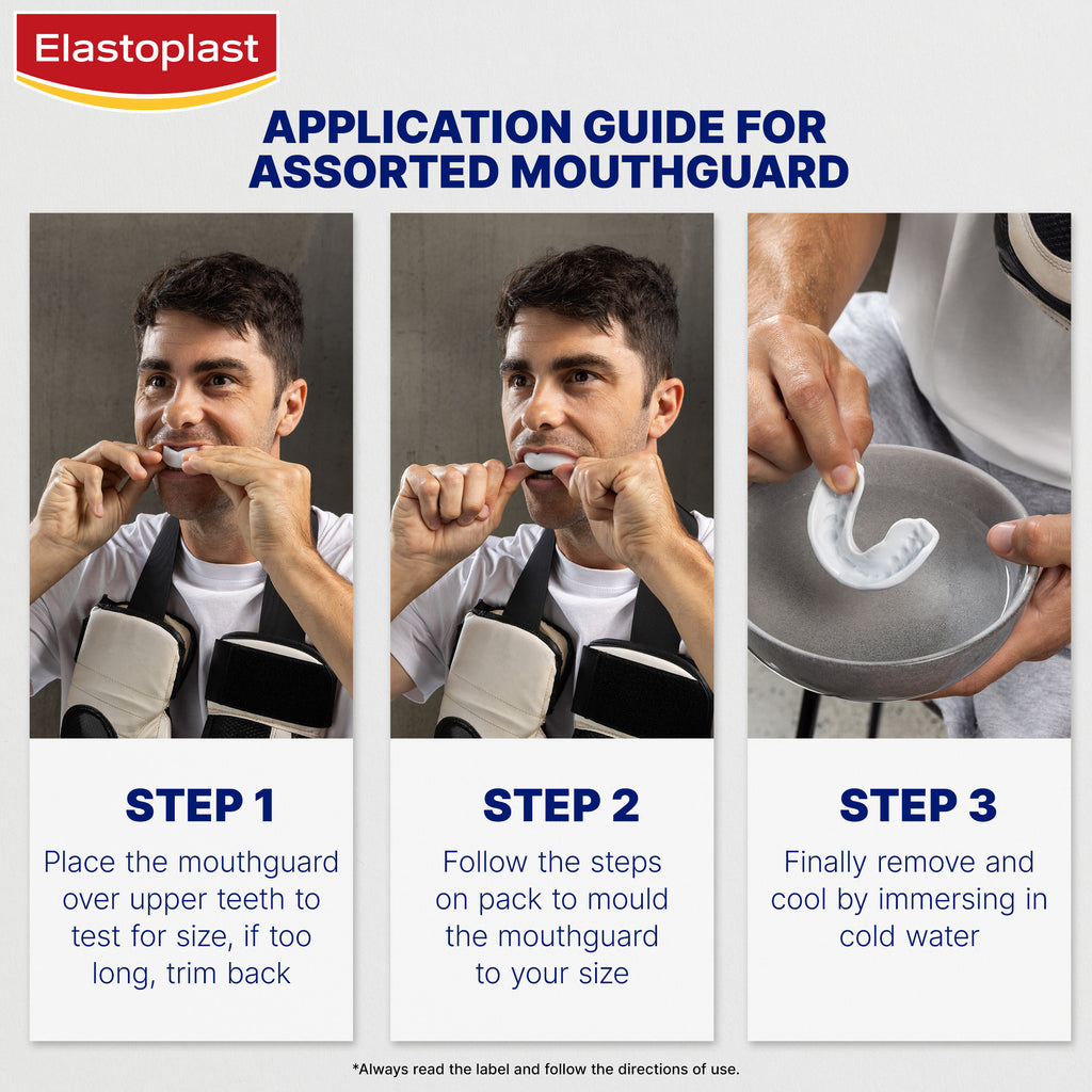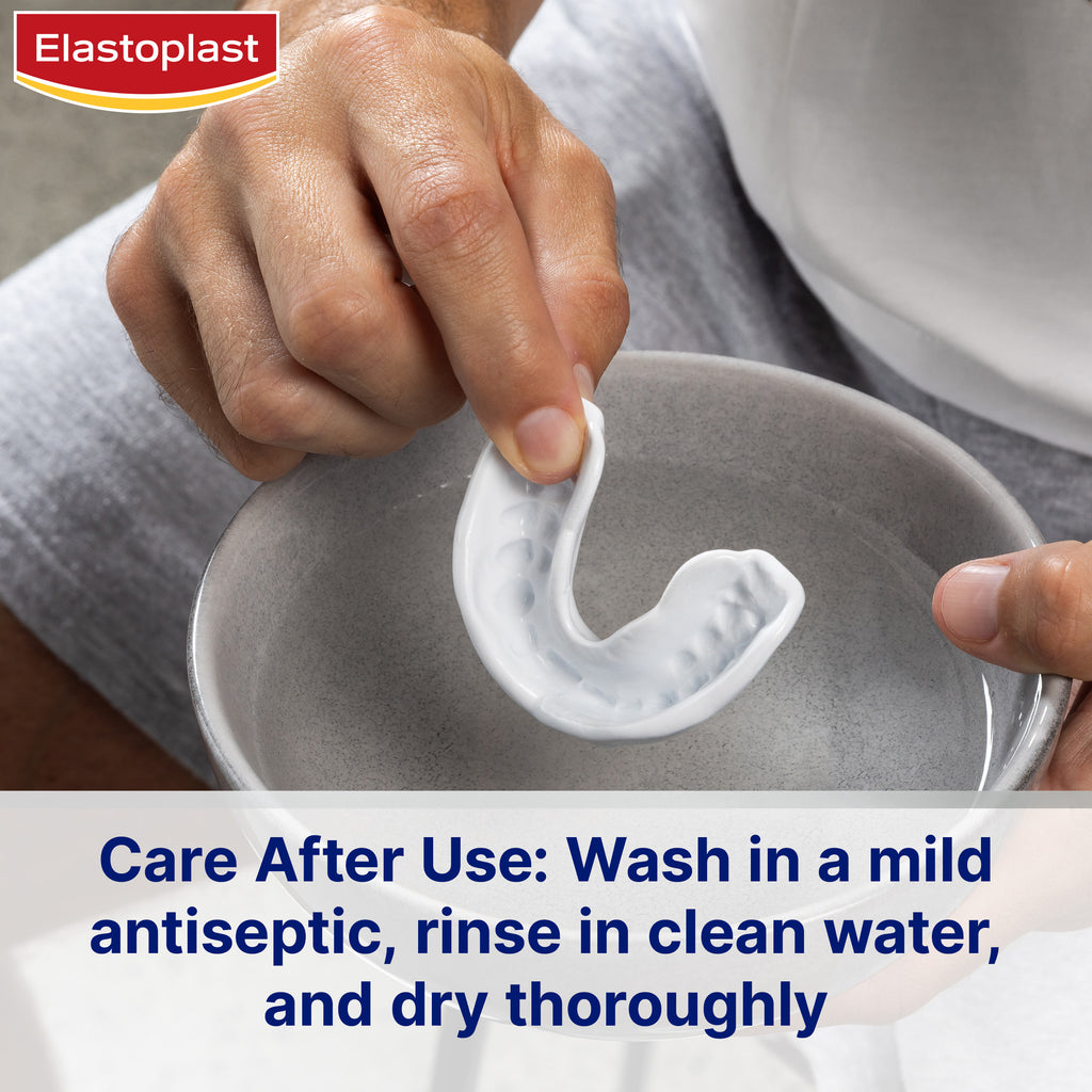 The Elastoplast Mouthguard is a ‘boil and bite’ product. It uses thermoplastic, which is BPA and latex free, that moulds to the shape of your teeth and jaw. This provides a snug fit and maximum support against impact. To use, place the Elastoplast Mouthguard over upper teeth to test for correct size, if too long, trim back until comfortable size is achieved then place the guard in near-boiling water for 10 seconds and remove with large spoon, shaking off water. Insert Mouthguard immediately in position and bite firmly but gently, to obtain even bite - the guard whilst feeling warm, will not burn the mouth. Whilst in this position, suck the Guard by exerting pressure with tongue against the roof of the mouth, this will help keep in place as you mould mouthguard around the side of teeth with forefinger to ensure tonight custom fit then cool by immersing in cold water. When correctly fitted, your Elastoplast Mouthguard will provide you with a personal fitting designed for your protection. It is recommended that after each use the Elastoplast Mouthguard be washed in a mild antiseptic, then rinsed in clean water under a tap and dry thoroughly before replacing in your personal mouthguard container.