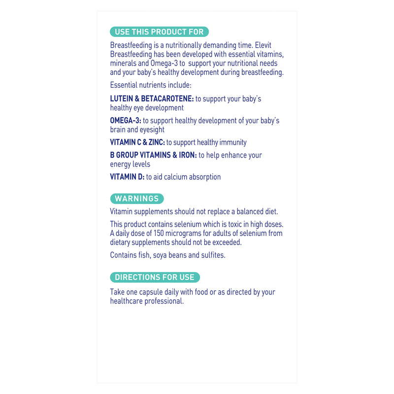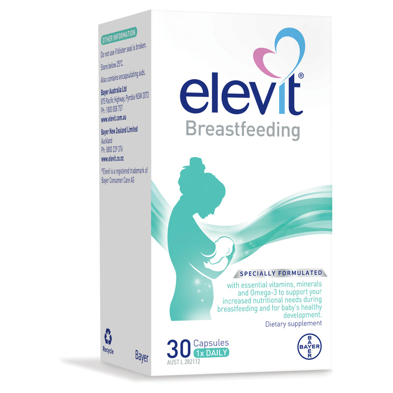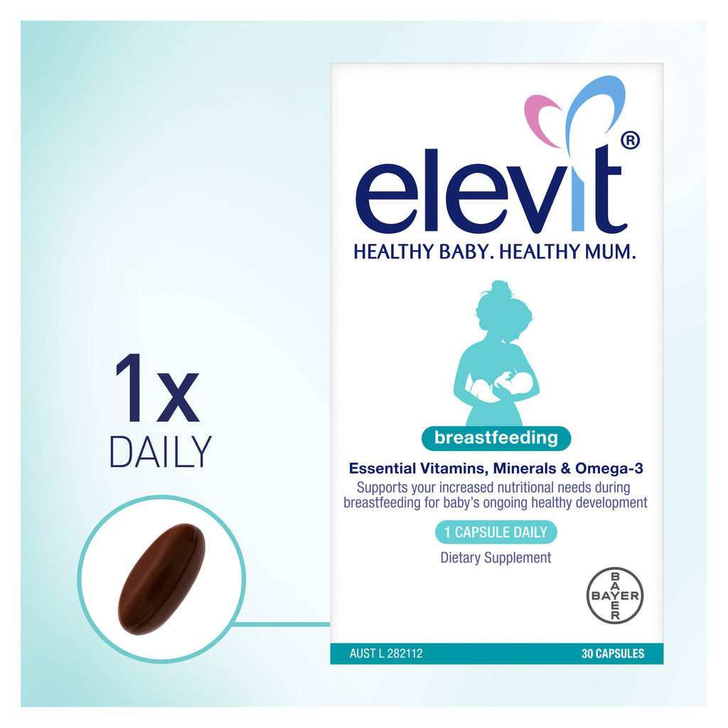 Breastfeeding is a nutritionally demanding time. Your nutritional requirements change after the arrival of your baby, and it can be hard to achieve those increased needs through diet alone. Elevit Breastfeeding is a specifically tailored breastfeeding multivitamin, to help support your increased nutritional needs and your baby's ongoing healthy development. It also supports vitality and energy of breastfeeding mums.Each Elevit Breastfeeding capsule has been specifically formulated with lutein, betacarotene, iodine, omega 3, B group vitamins, and iron which are important for the overall health of your baby during this breastfeeding period.Start taking Elevit Breastfeeding immediately after birth, to support baby's immunity, brain and eye development, and help boost your energy levels. - One convenient capsule a day. - Tailored to support Mum's increased nutritional needs during breastfeeding for baby's ongoing healthy development. - Supports baby's immunity, brain and eye development. Helps boost Mum's energy levels. - Nutrient requirements increase significantly during breastfeeding and are unique to this stage. - Contains vitamins and minerals to support breastfeeding mums and babies, including lutein, betacarotene, iodine, omega 3, B group vitamins, and iron.Switch from Elevit Pregnancy Multivitamin to Elevit Breastfeeding after birth, to support your new nutritional needs.