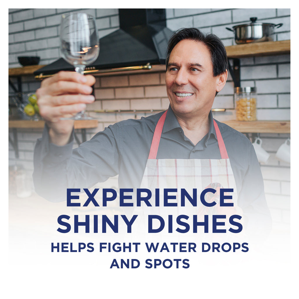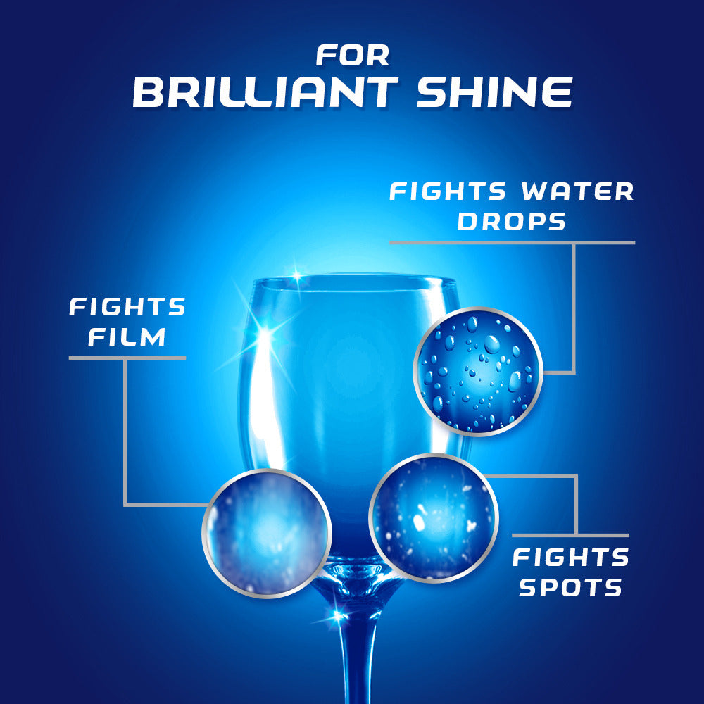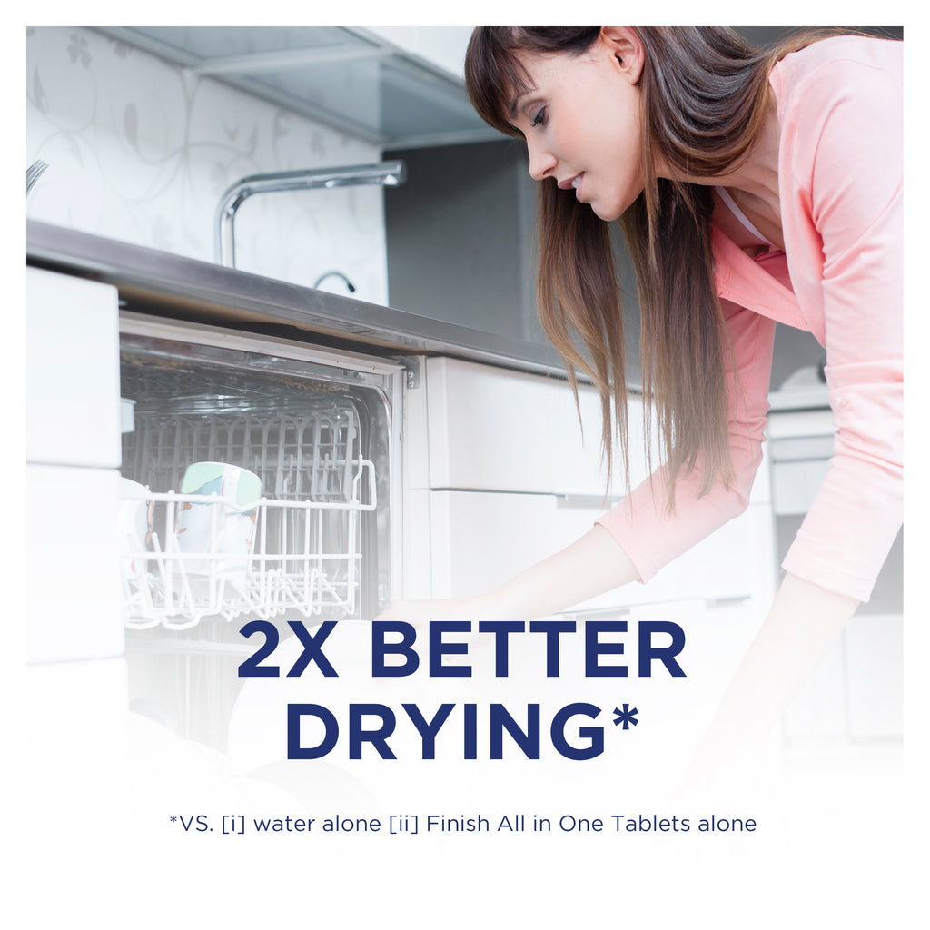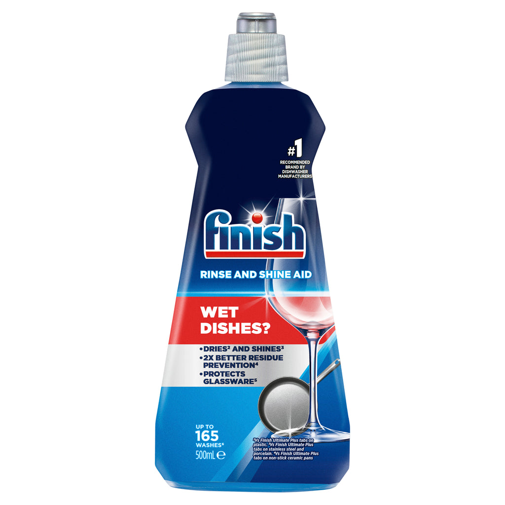 Wet dishes?- Dries (vs Finish Ultimate Plus tabs on plastic) and shines (vs Finish Ultimate Plus tabs on stainless steel and porcelain)- 2x better residue prevention (vs Finish Ultimate Plus tabs on non-stick ceramic pans)- Protects glasses (vs Finish Ultimate Plus tabs)Finish Rinse & Shine AidYour dishes may come out of the dishwasher wet or with watermarks, and your glasses may appear cloudy. Finish Rinse & Shine Aid dries (vs Finish Ultimate Plus tabs on plastic) & shines (vs Finish Ultimate Plus tabs on stainless steel and porcelain) delivers 2x better residue prevention (vs Finish Ultimate Plus tabs on non-stick ceramic pans), and provides glassware protection (vs Finish Ultimate Plus tabs). Simply add to your regular cycle for great drying (vs Finish Ultimate Plus tabs on plastic) and shining (vs Finish Ultimate Plus tabs on stainless steel and porcelain) results versus Finish Ultimate Plus dishwasher tablets!