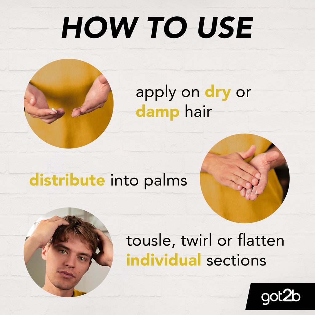 Use on damp or dry hair. Rub into your palms and tousle, twitch or flatten sections of your hair as you like.