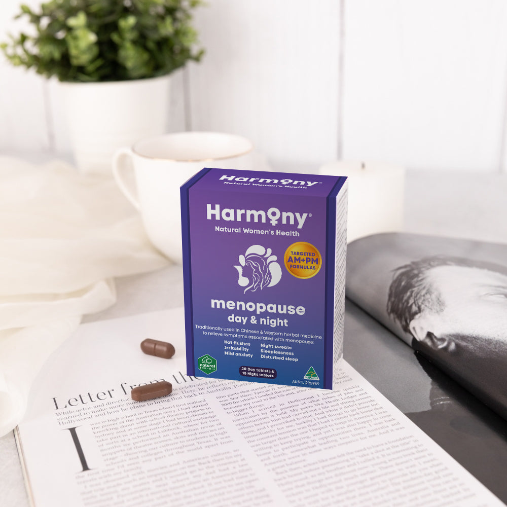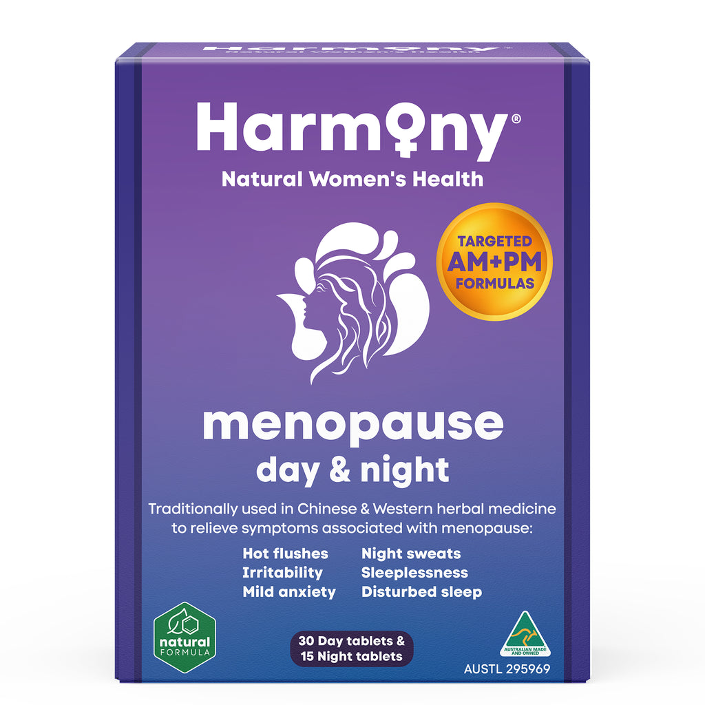 Harmony Menopause Day & Night contains herbs traditionally used in Chinese and Western herbal medicine to relieve symptoms associated with menopause (and perimenopause), to promote sleep quality and relieve restless sleep.