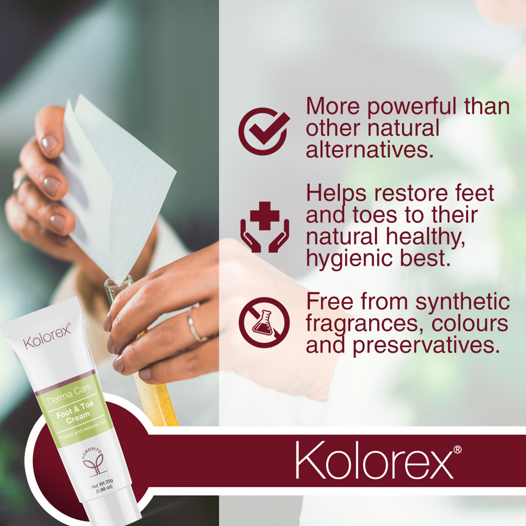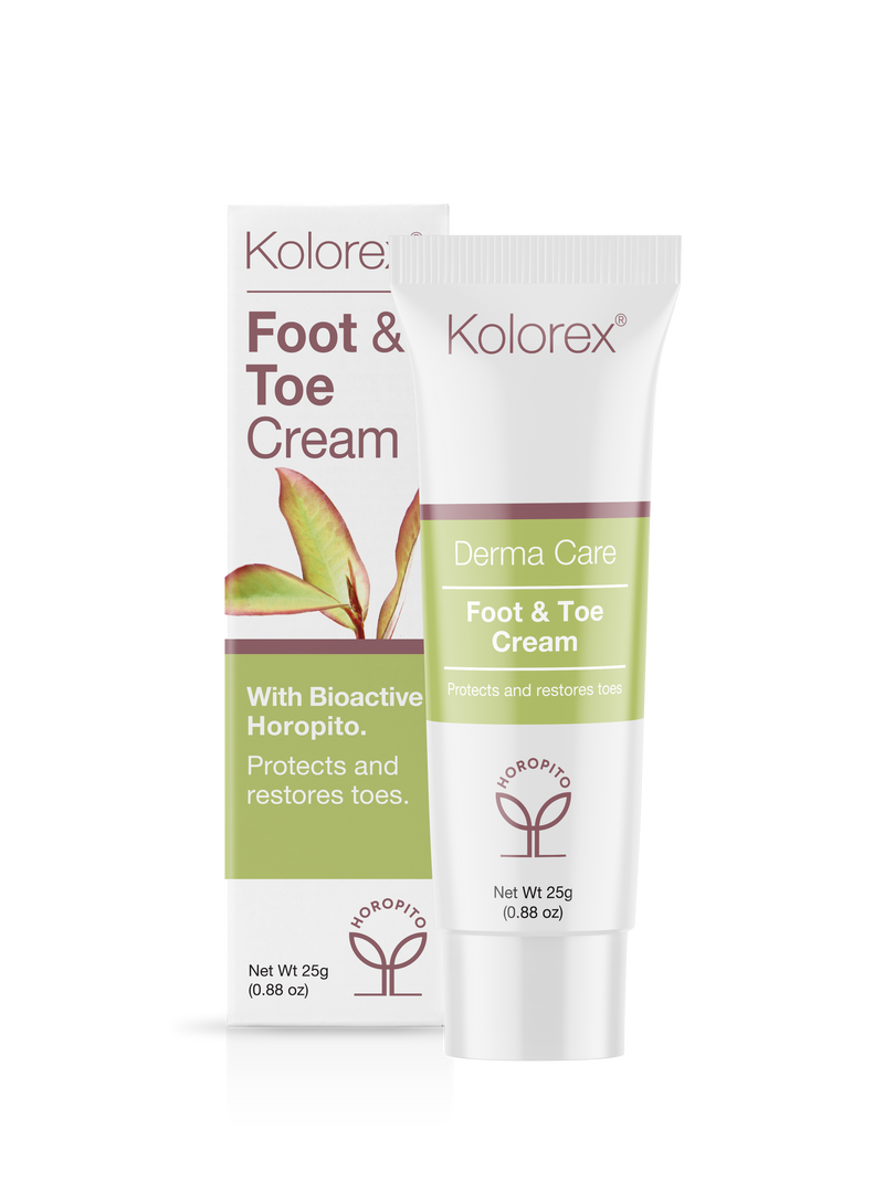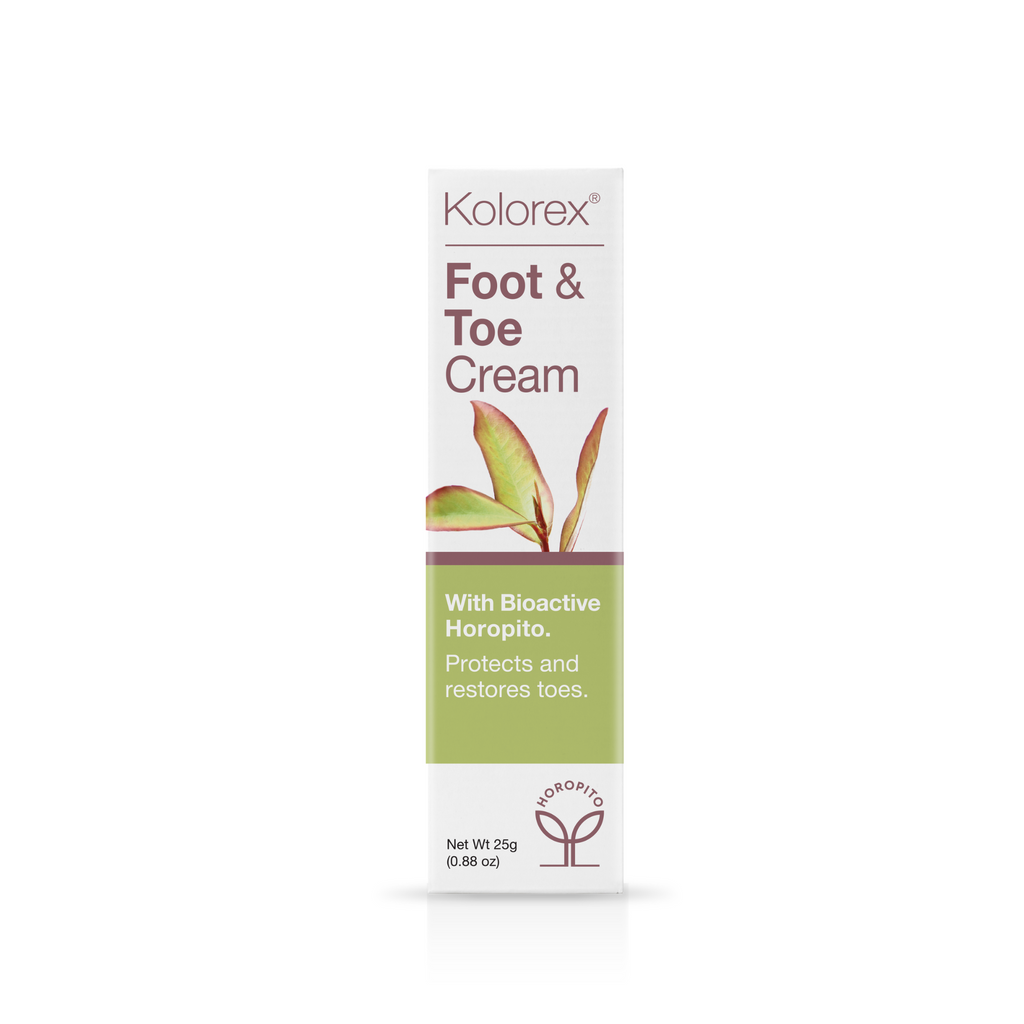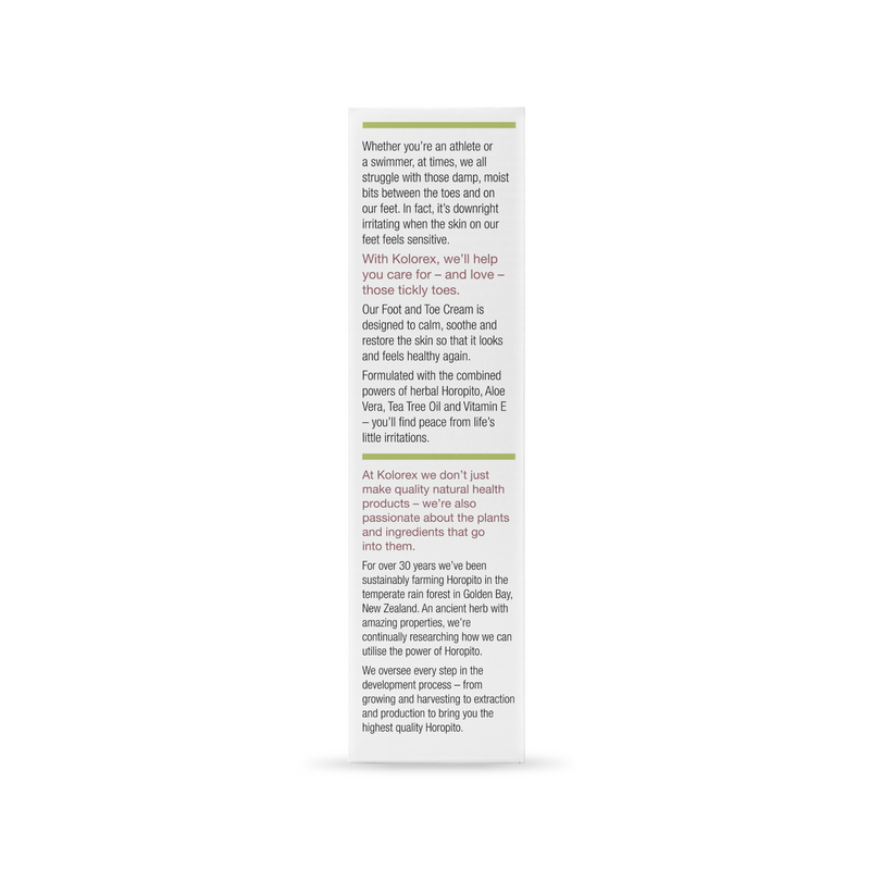 Kolorex® Foot & Toe Cream - whether you’re an athlete or a swimmer, at times, we all struggle with those damp, moist bits between the toes and on our feet. Kolorex Foot and Toe Cream will help you care for – and love – those tickly toes. Designed to calm, soothe and restore the skin so that it looks and feels healthy again and formulated with the combined powers of herbal Horopito, Aloe Vera, Tea Tree Oil and Vitiman E – you’ll find peace from life’s little irritations.