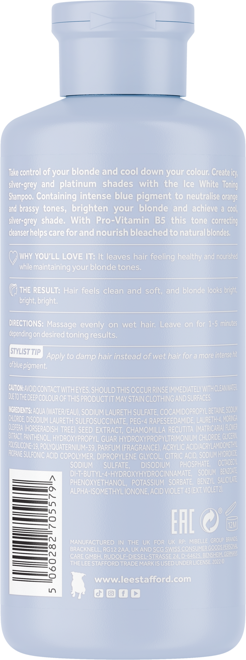 Freshly bleached hair looks bright and beautiful but can go brassy over time leaving you with warm, orange tones. Our Iconic Ice White Toning Shampoo is a crucial colour corrector for platinum blondes. The true blue pigments within our indigo formulation knocks out nasty brassiness leaving hair icy cool.