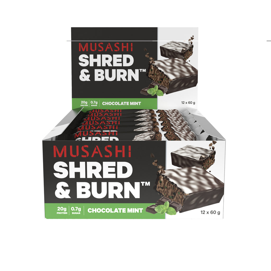 MUSASHI SHRED & BURNTM protein bar is designed to provide 20g of high quality protein and also contains a powerful blend of Garcinia Cambogia, Green Tea extract and L-Carnitine.