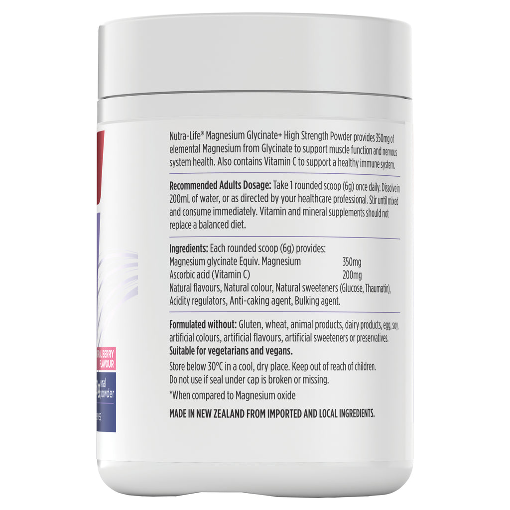 Nutra-Life® Magnesium Glycinate+ High Strength Powder provides 350mg of elemental Magnesium from Glycinate to support muscle function & nervous system health. Also contains Vitamin C to support immune system health.