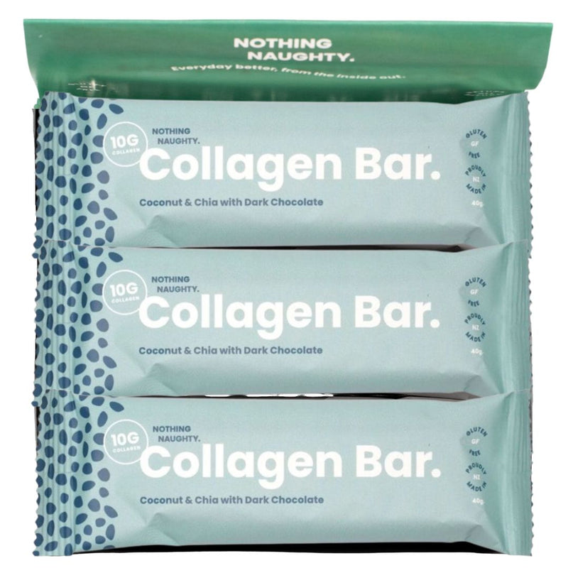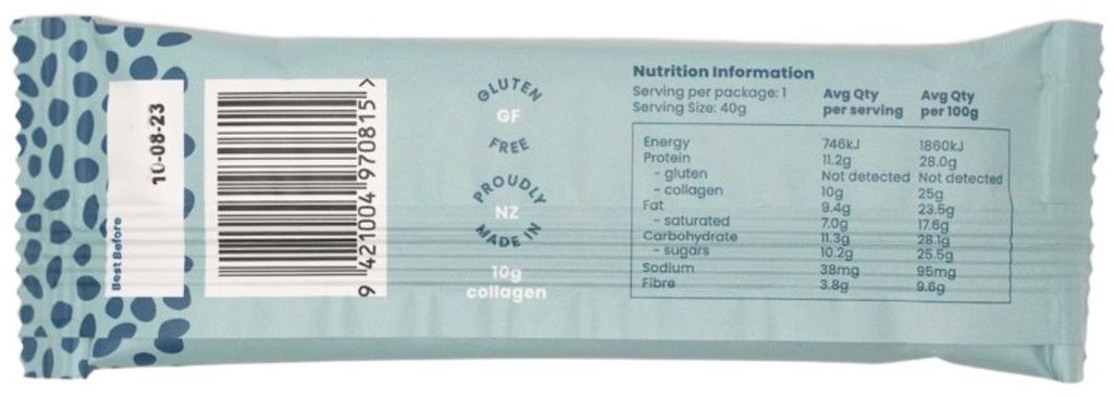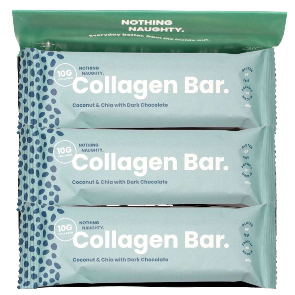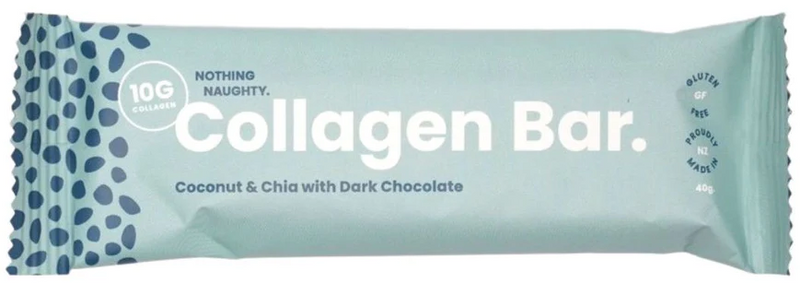 GLUTEN & DAIRY-FREEIt's what's inside that counts. 7.5g of collagen in a delicious coconut and chia bar, lightly coated in dark chocolate. The convenient way to get a collagen boost, perfect for the handbag, gym bag, or workplace for a snack on the go.