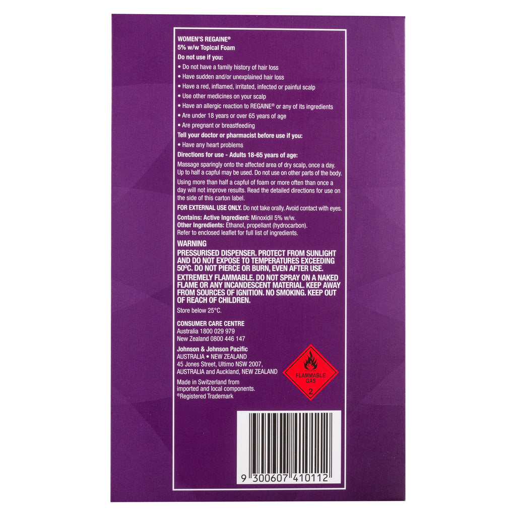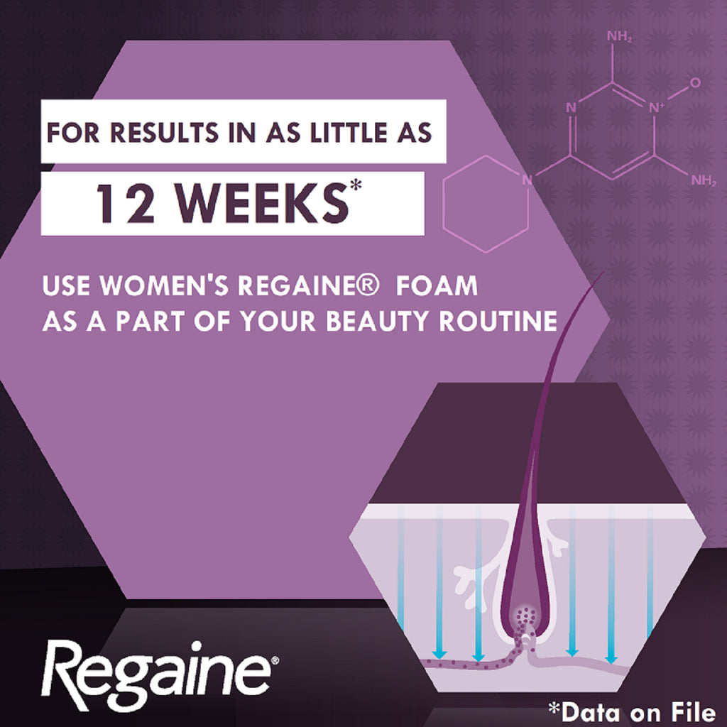 Regrow your hair with Regaine Women's Once A Day Extra Strength Foam. This minoxidil foam reactivates hair follicles to stimulate regrowth. Make this hair loss treatment for women a part of your everyday routine for results you may begin to see in as little as 12 weeks*.Is this suitable for your type of hair loss?Women's Regaine is for women who have general thinning of hair at the top of the scalp (vertex).Women’s REGAINE Foam is:- A once-a-day hair regrowth treatment- Easy to use- Fast drying. This hair loss product doesn’t interfere with your hair care routine.How does Women’s REGAINE Foam work?- Reactivates hair follicles to stimulate regrowth- Increases and prolongs the hair growth phase- Helps grow lhicker hair follicles over time5% minoxidil topical foam w/wThis pack contains a 2 month supply (2 x 60g).*Blume-Peytavi et al. J Drugs Dermatol. 2016;15(7):883-889