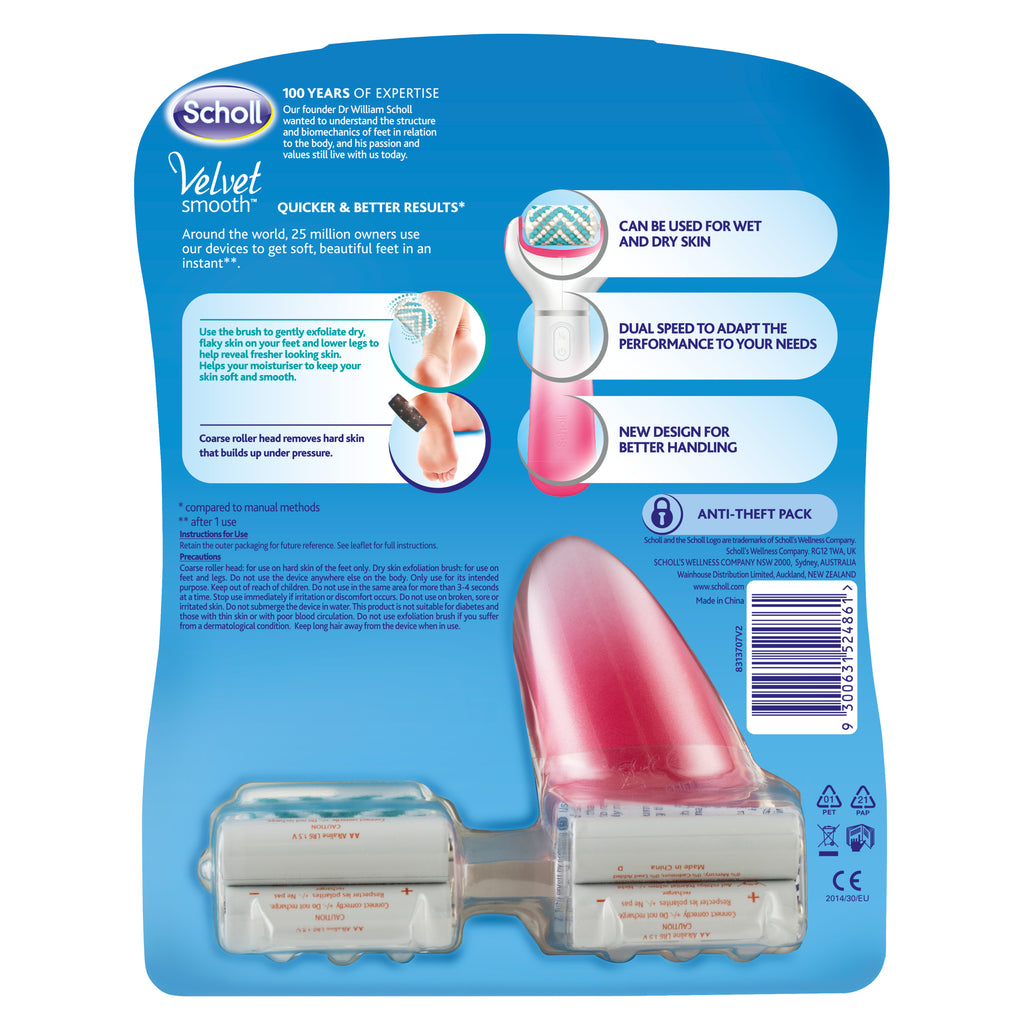 NEW and Improved Scholl Electronic Foot Care System for hard skin removal + dry skin exfoliation, brought to you by Scholl with 100 years of expertise!