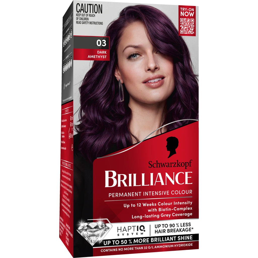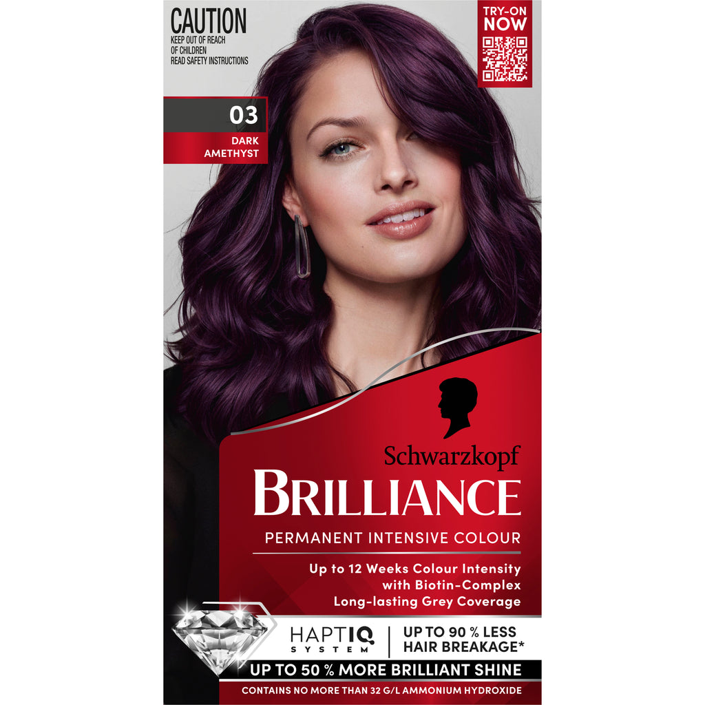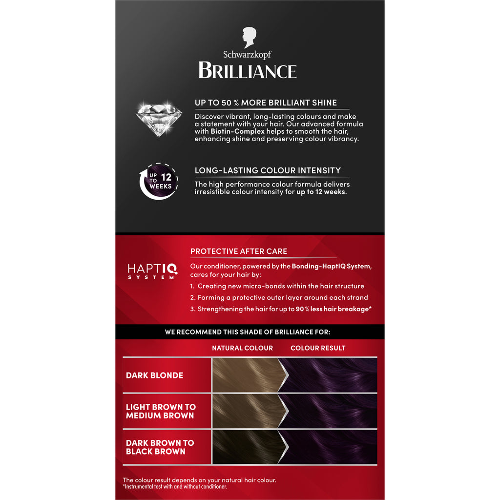 Experience professional-quality hair colouration at home with Schwarzkopf Brilliance. The advanced hair dye formula with Biotin-Complex smooths hair, enhances shine and preserves colour vibrancy. Delivering irresistible colour intensity for up to 12 weeks, ensuring long-lasting grey coverage. We recommend this shade for dark blonde, light brown to medium brown and dark brown to black brown hair. Powered by our innovative Bonding HAPTIQ System, the caring conditioner is designed to strengthen hair structure by up to 90% less hair breakage*. Want even more shine? Compliment your new look with our Schwarzkopf Brilliance Gloss to enhance your hair colour.For maximum confidence, each pack includes a virtual try-on QR code so you can find your perfect shade—scan, try it, and love it before you colour.*Instrumental test with and without conditioner.
