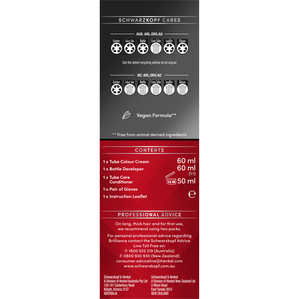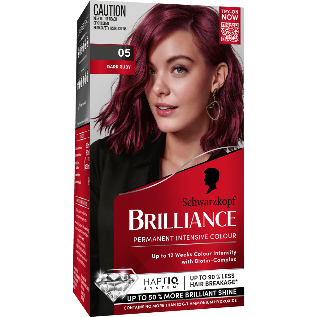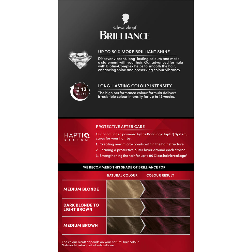 Experience professional-quality hair colouration at home with Schwarzkopf Brilliance. The advanced hair dye formula with Biotin-Complex smooths hair, enhances shine and preserves colour vibrancy. Delivering irresistible colour intensity for up to 12 weeks. We recommend this shade for medium blonde, dark blonde to light brown and medium brown. Powered by our innovative Bonding HAPTIQ System, the caring conditioner is designed to strengthen hair structure by up to 90% less hair breakage*. Want even more shine? Compliment your new look with our Schwarzkopf Brilliance Gloss to enhance your hair colour.For maximum confidence, each pack includes a virtual try-on QR code so you can find your perfect shade—scan, try it, and love it before you colour.*Instrumental test with and without conditioner.