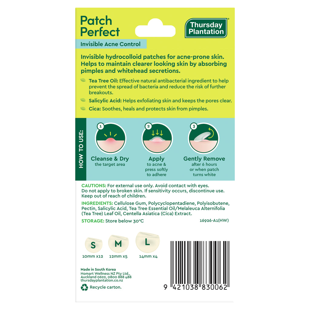 Thursday Plantation Patch Perfect is your triple-action solution for pimples—gentle on skin, tough on acne. Powered by the secret to clearer-looking skin – Tea Tree Oil – and boosted with Salicylic Acid and Cica, each ultra-thin hydrocolloid patch works hard to absorb pimples and whiteheads, reduce redness, and calm irritation.• Tea Tree Oil – a natural antibacterial to help control breakouts by preventing the spread of bacteria• Salicylic Acid – gently exfoliates to keep pores clear• Cica – soothes, heals, and protects irritated skin Invisible under makeup or worn overnight, Patch Perfect fits seamlessly into your routine.Breathable, barely-there, and dermatologically tested, it’s your go-to patch for clear, confident skin—anytime, anywhere.
