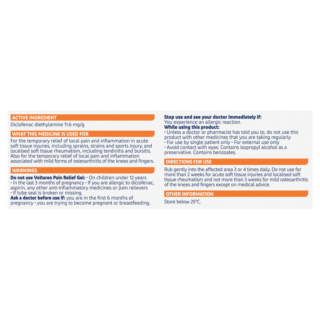 Do you have pain, tenderness or swelling associated with inflammation or injury? Rub Voltaren Pain Relief Gel on your point of pain for targeted pain relief. Voltaren Pain Relief Gel penetrates deep into your skin with a dual benefit that relieves pain and reduces inflammation.Voltaren Pain Relief Gel is a medicated product containing a non-steroidal anti-inflammatory drug, or NSAID, in the form of an emulsion gel. The active ingredient (diclofenac) in our gels penetrates deep into the skin, reducing inflammation at the source to relieve pain.It works differently from heat or cooling rubs, that work by heating or cooling the skin. Voltaren Pain Relief Gel instead allows an anti-inflammatory (diclofenac) to penetrate the skin deep down in order to relieve pain and reduce inflammation where you need it.Voltaren Pain Relief Gel can be used for the relief of pain and inflammation in soft-tissue injuries, trauma of the tendons, ligaments, muscles and joints, due to sprains and strains (e.g. in sports injuries), Localised forms of soft tissue rheumatism including tendonitis and bursitis. It can also be used to relieve mild osteoarthritis pain of the knees and fingers.Voltaren Pain Relief Gel formula combines the qualities of a gel and a cream, that has an appealing smell, is easy to rub in and rapidly absorbed, and even provides a cooling and soothing effect when applied to the skin. Delivering pain relief to help you get back to the movement that you love!Carefully read all information provided with the product before use